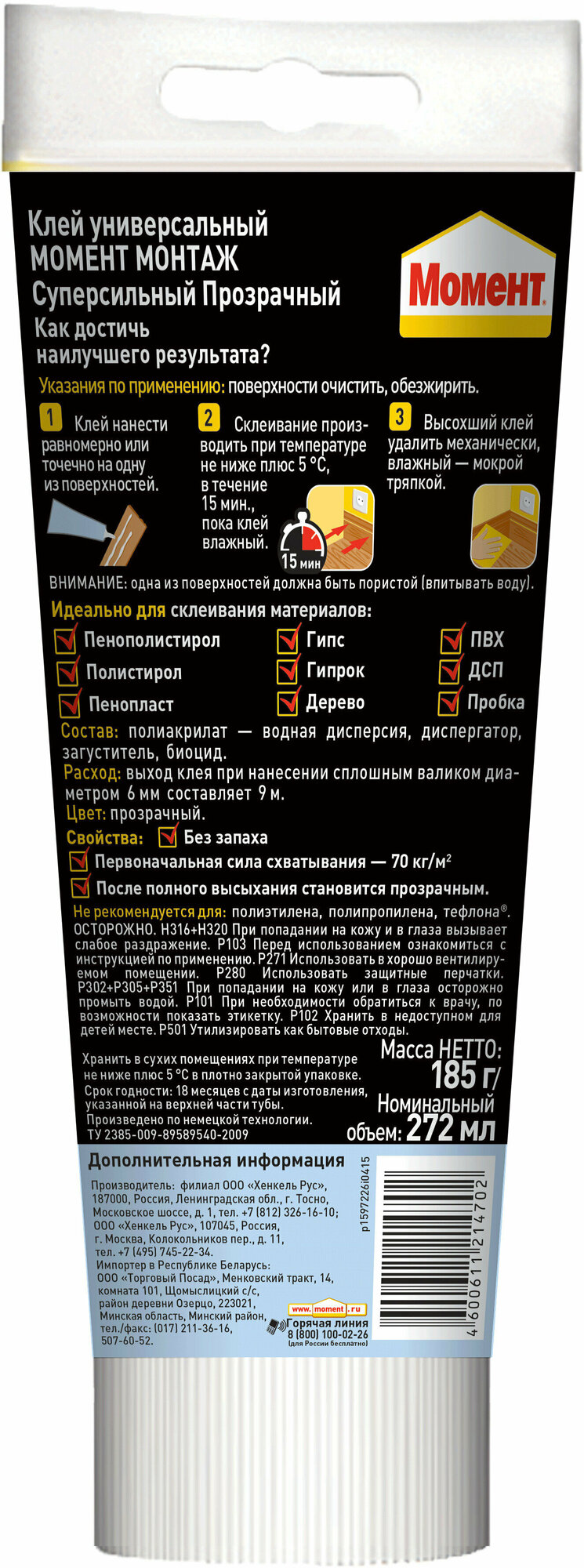 Купить Клей Момент Монтаж Суперсильный Прозрачный МВп-70 185г (1317436), 1302575