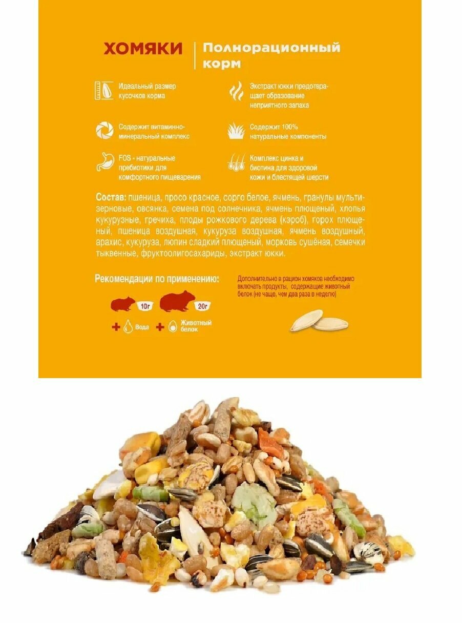 | Отзыв: | Давно кормлю хомяков этим кормом. Шикарный. Хомячки его едят, активные. Мне всё нравится |