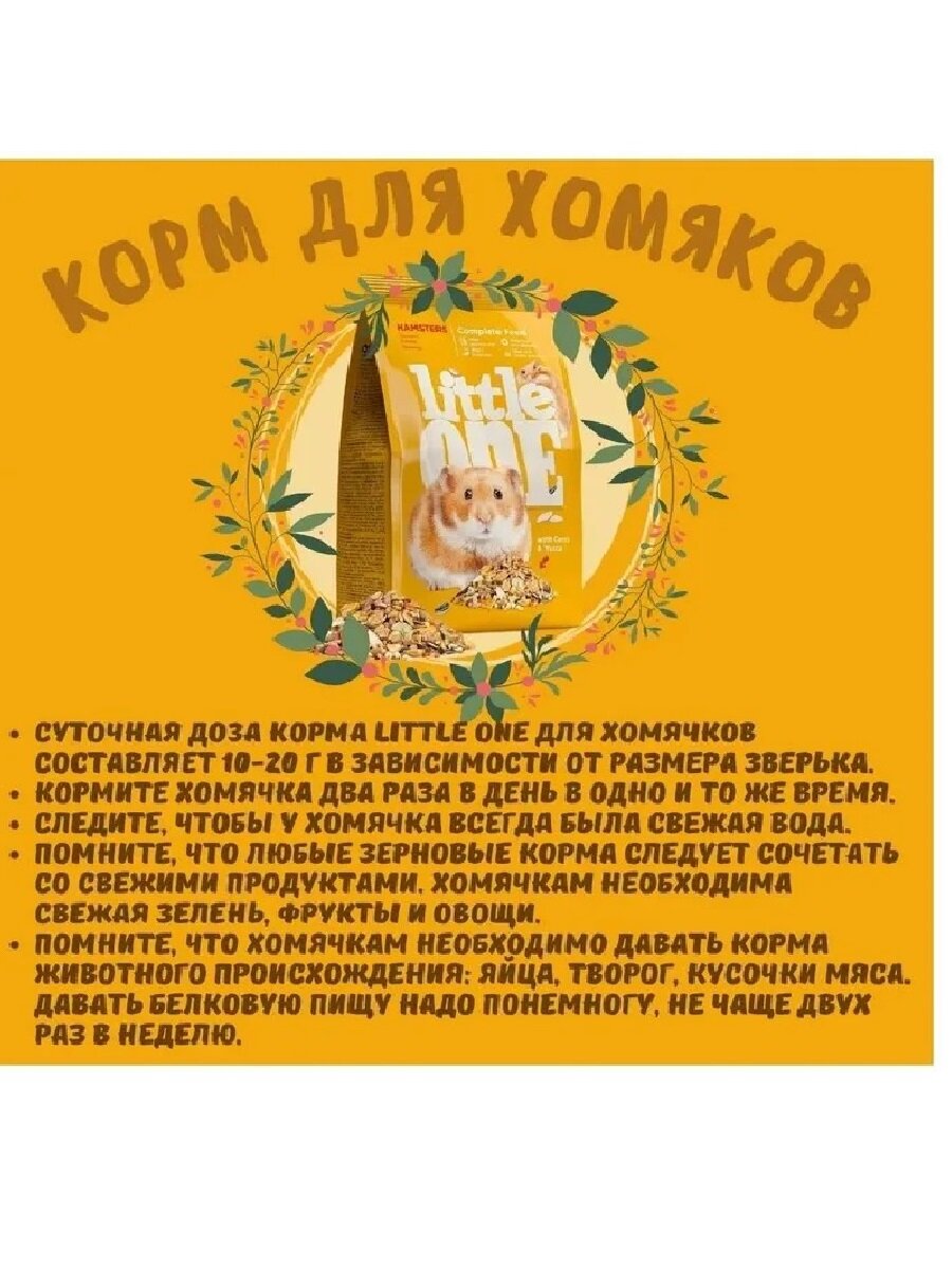 | Отзыв: | С 2017 года у меня живут джунгарские хомячки и я разбираюсь в кормах. За эти два года мы не нашли у нас в городе корма лучше little one. Мои хомяки здоровые и счастливые, потому что отлично питаются. На нашем счету уже более 10-ти купленных пачек корма little one. А новая упаковка-безумно красивая вещь. Очень нравится, что на упаковке появились и джунгарики и сирики, а сзади нужная и полезная информация. Также у нас есть вся линейка лакомств LO. Мои хомячки не едят ничего, кроме LO, поэтому они здоровы!