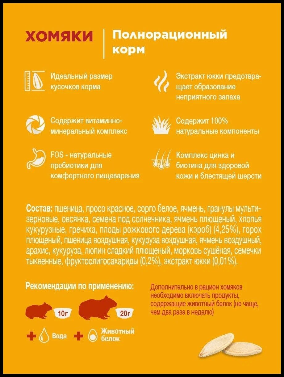 Много хомячинных вкусняшек Недостатки: Дороговат маленькая пачка стоит ~ 116 руб А большая ~200 Корм притарно пахнет Этот корм самый лутьший из всех которыы я пакупала |