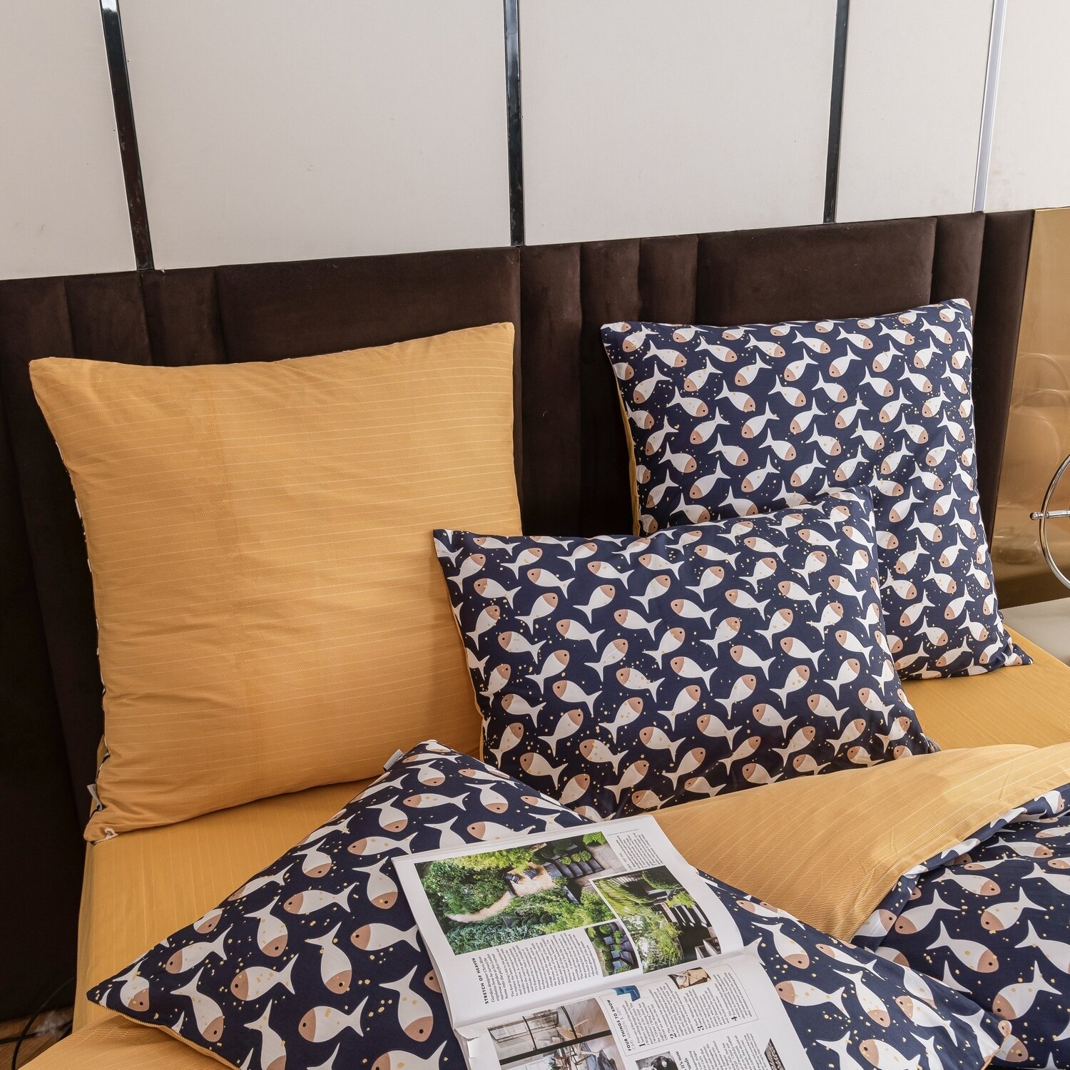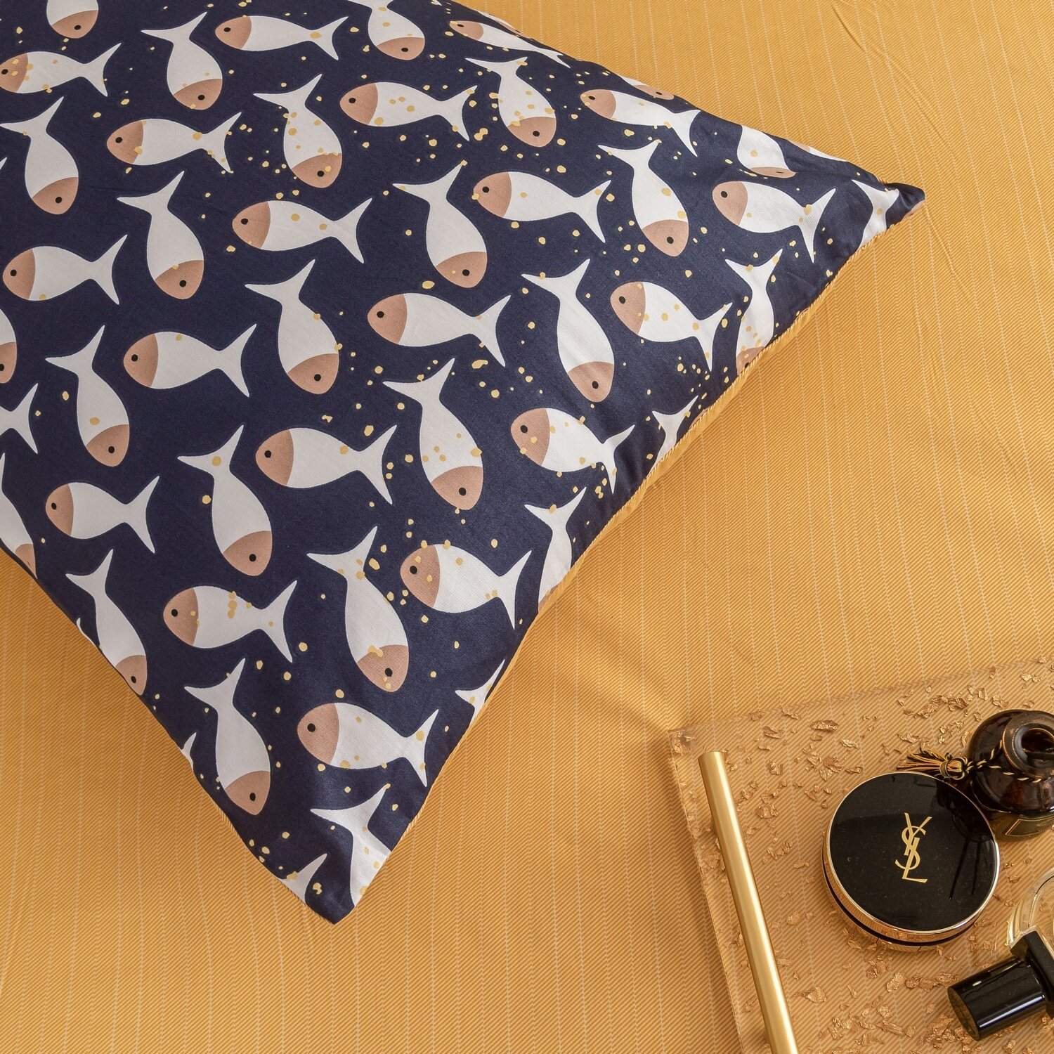 Постельное белье Семейное геометрия, сатин люкс, 100% хлопок, 4 наволочки на молнии 50x70 70х70 / Комплект постельного белья Семейный желтый