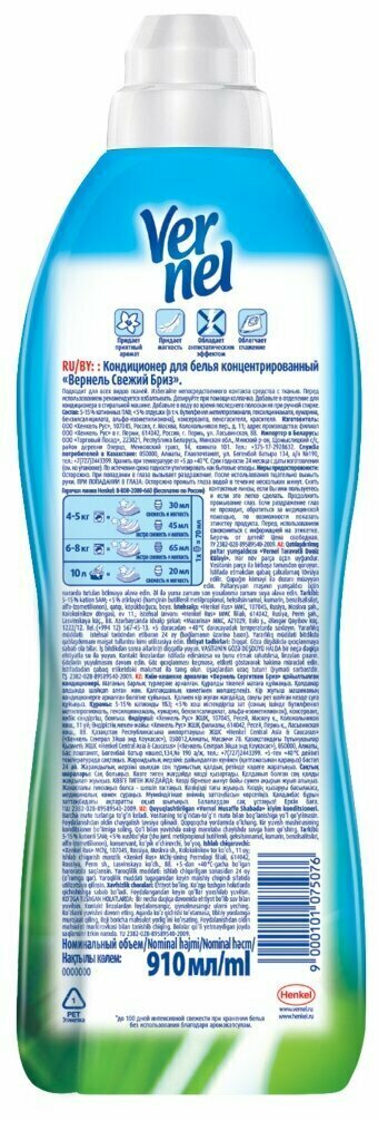 Ниже Вы можете прочитать отзывы на Вернель Кондиционер-ополаскиватель для белья Свежий бриз 910 мл, ознакомится с подробными характеристиками, посмотреть интересные обзоры и фотографии на Вернель Кондиционер-ополаскиватель для белья Свежий бриз 910 мл.