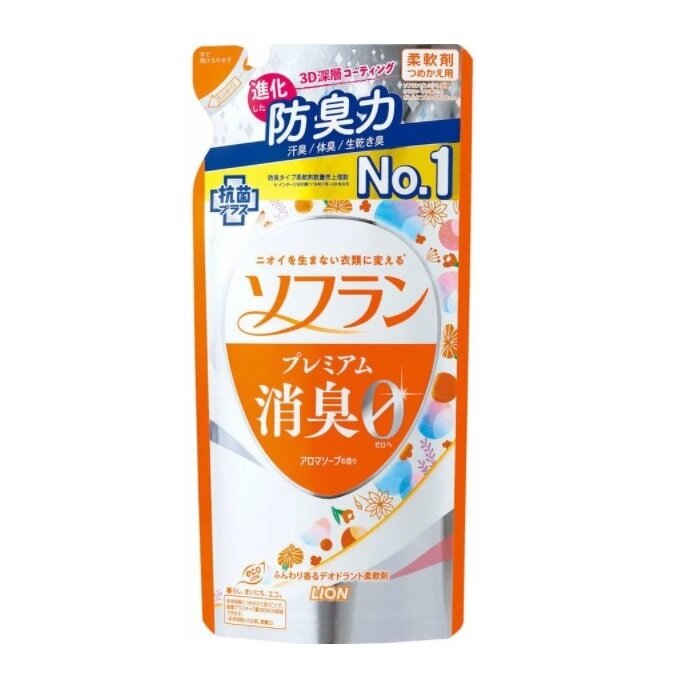 LION Кондиционер для белья "SOFLAN" (с мощным антибактериальным эффектом для защиты от неприятного запаха "Premium Deodorizer 018" - натуральный фруктовый аромат) 380 мл, мягкая упаковка