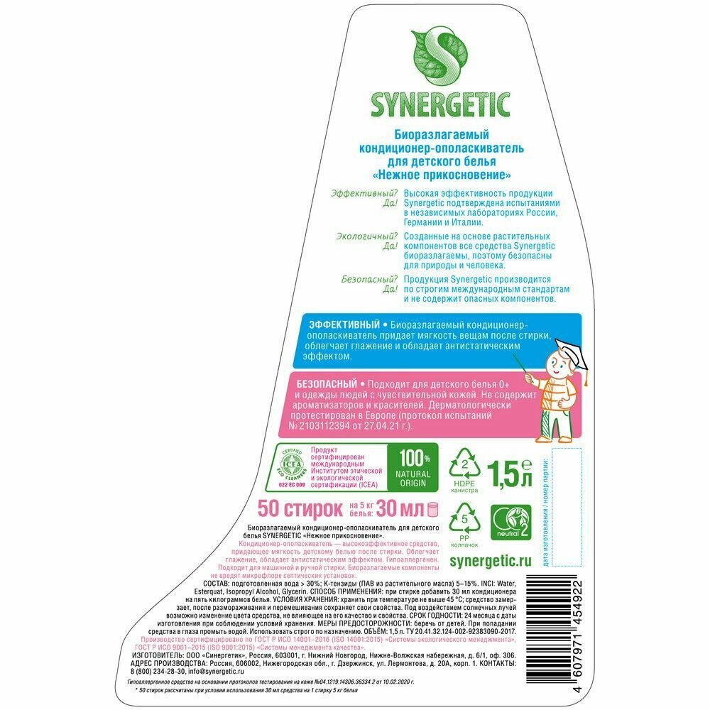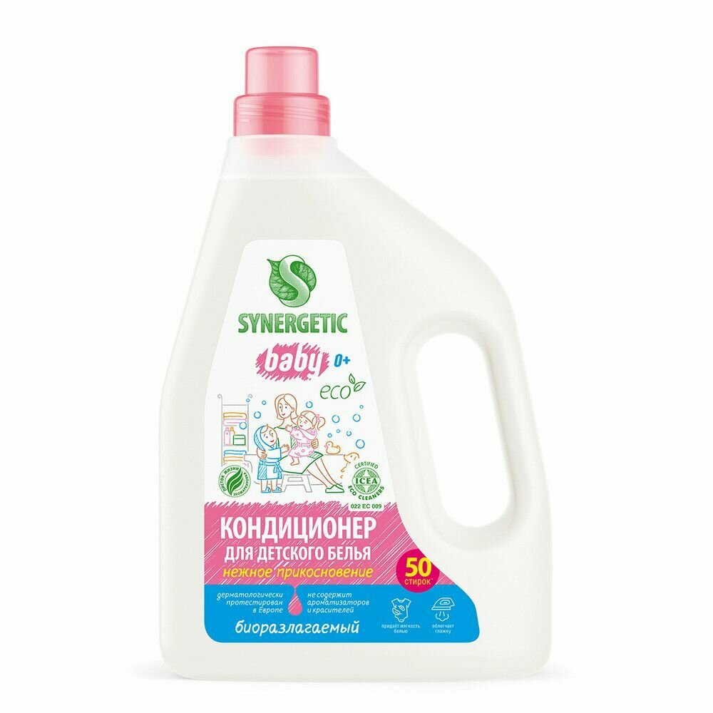 Купить Кондиционер-ополаскиватель для детского белья Synergetic, 2 штуки, нежное прикосновение, 1,5 л, 50 стирок