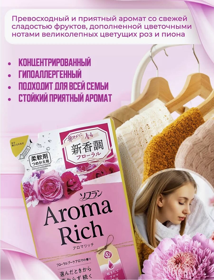 Кондиционер для белья Lion Япония Soflan Aroma Rich Catherine, персик, клубника, роза и пион, 400 мл