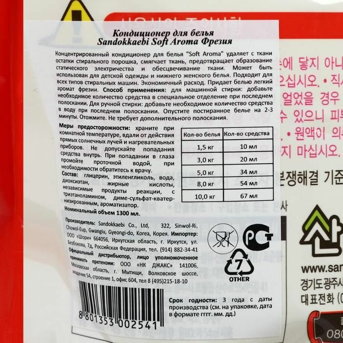 Купить Кондиционер-ополаскиватель для белья Sandokkaebi Soft Aroma Фрезия, концентрат, 1.3 л, мягкая упаковка