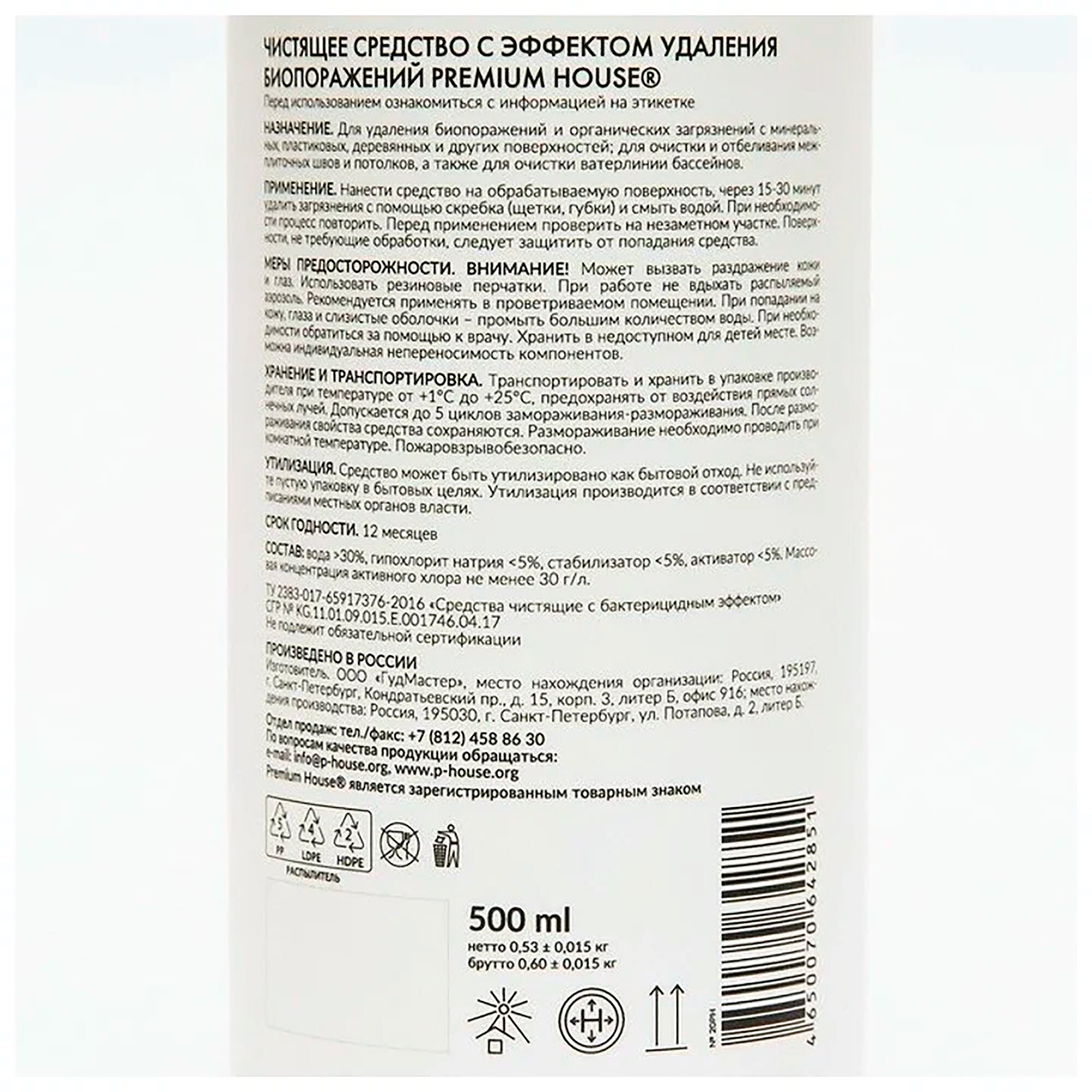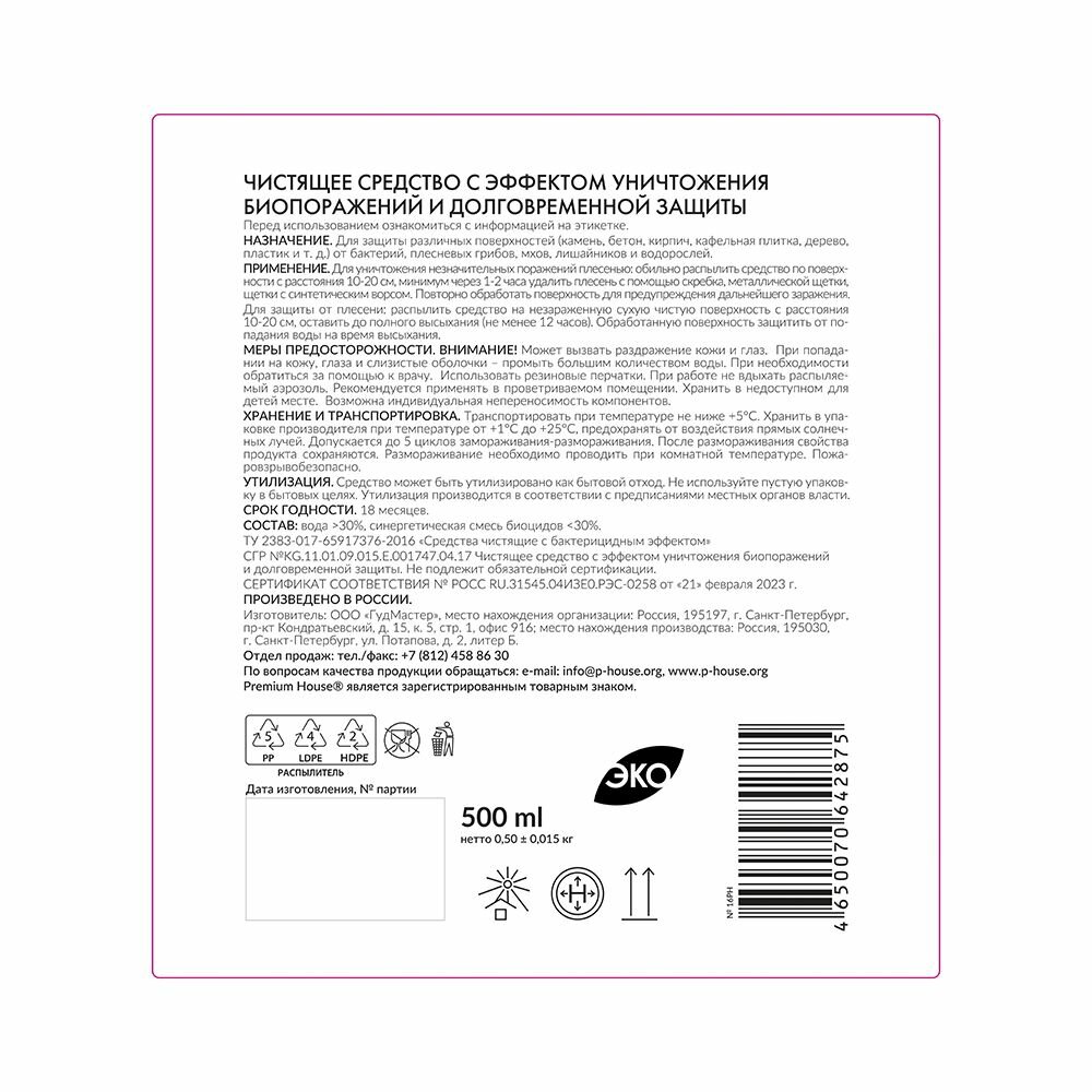Высокоактивное средство для удаления плесени и биопоражений (Спрей 0,5 л) Premium House