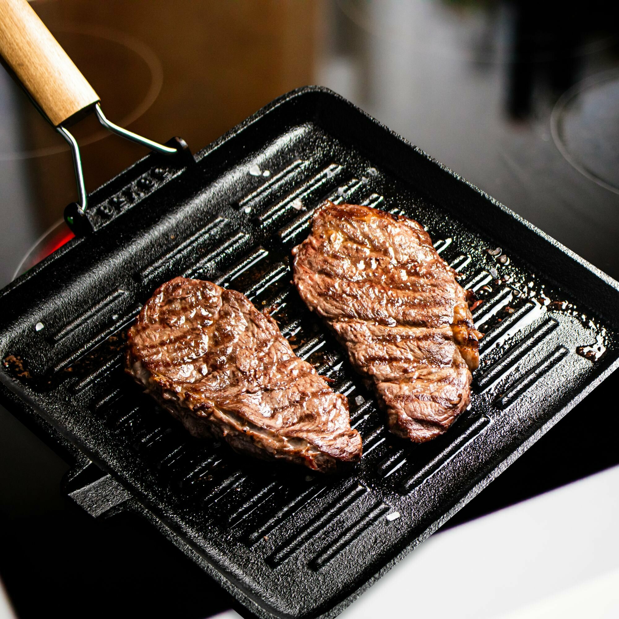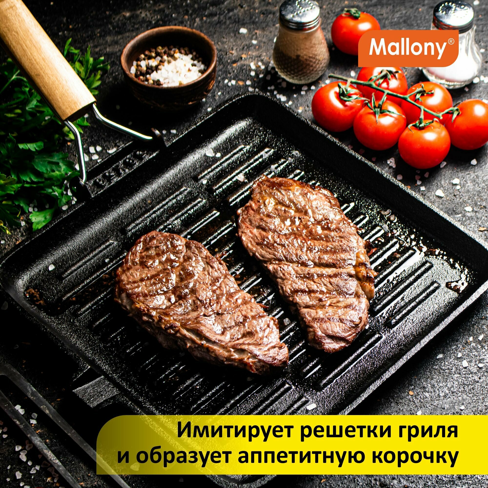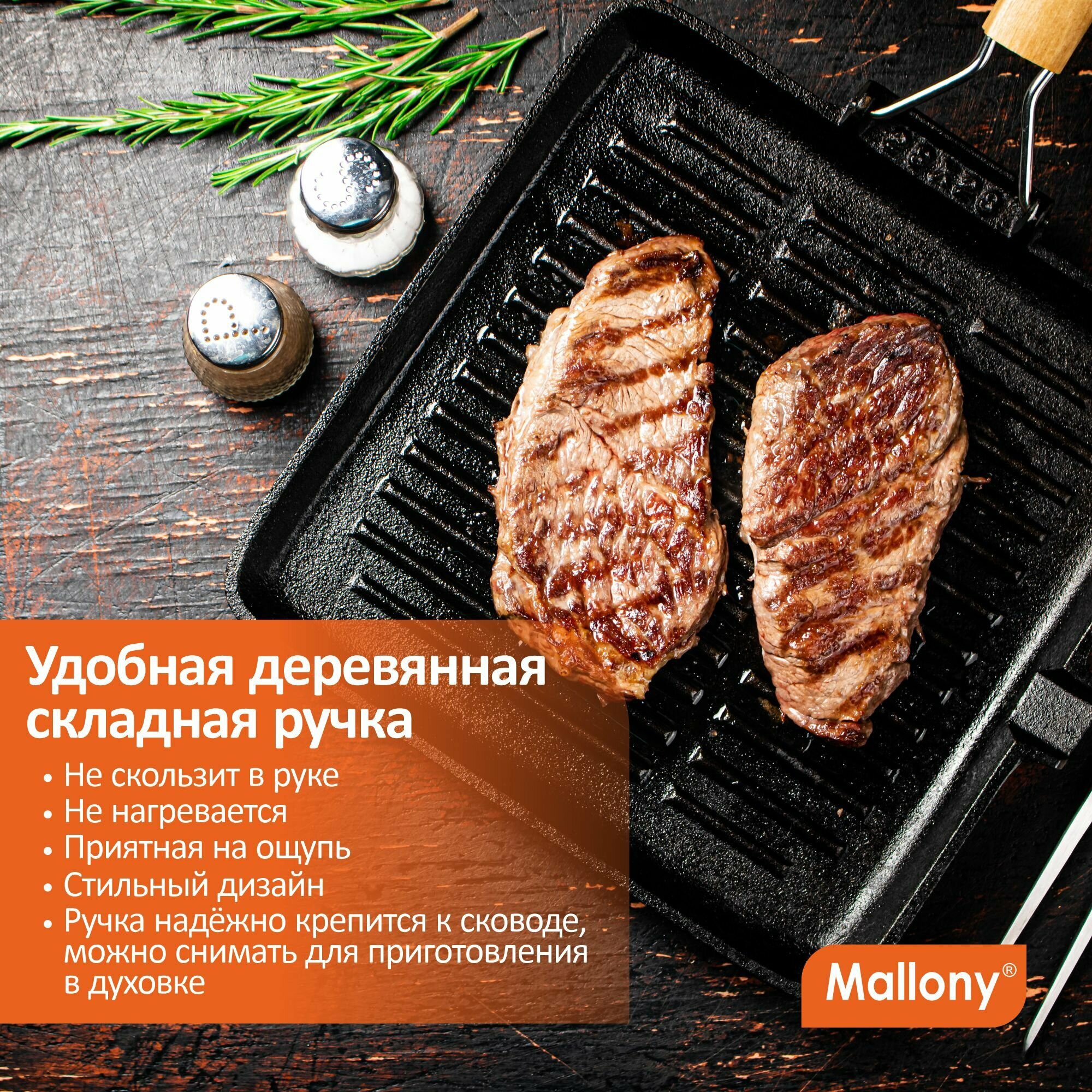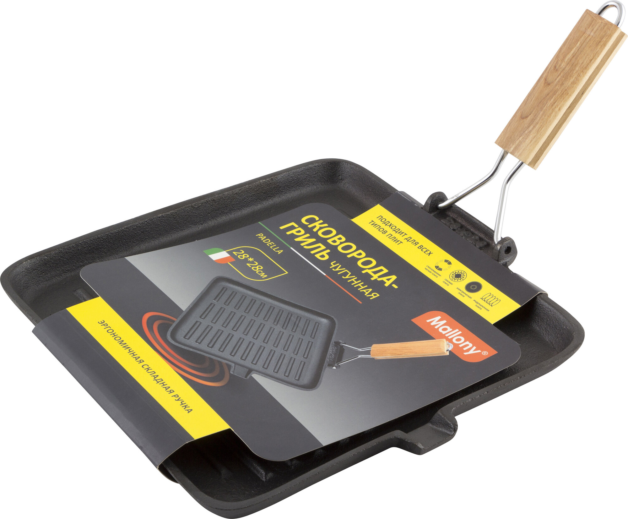 Сковорода-гриль Mallony , чугунная, с деревянной складной ручкой, 28X28 см