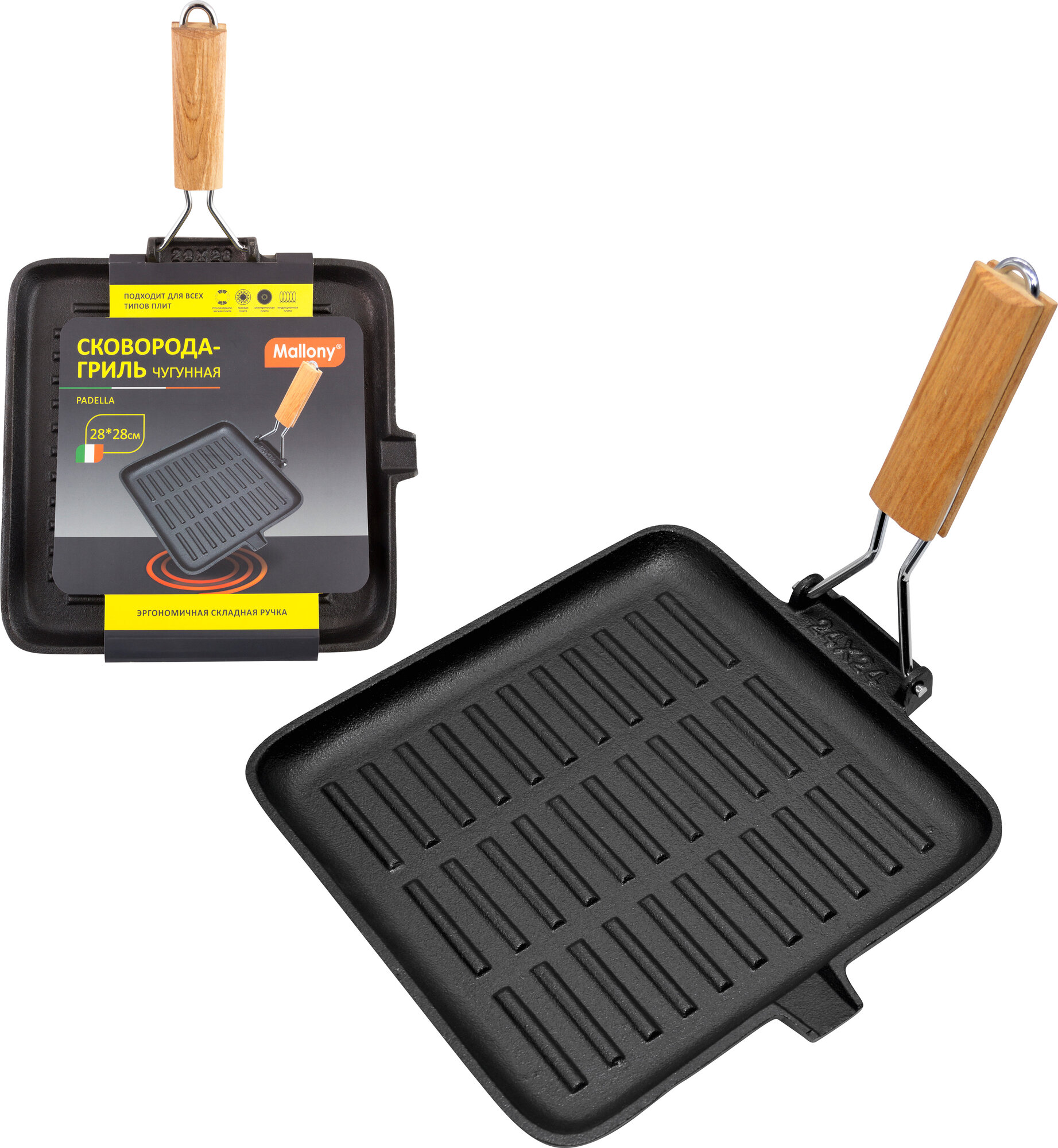 Сковорода-гриль чугунная Mallony Padella с деревянной складной ручкой, квадрат-28 см (985060)