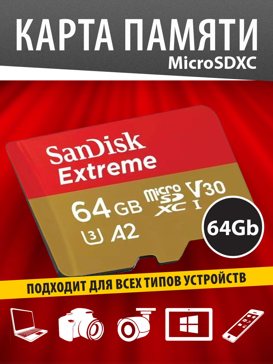 Оригинальная Карта памяти Sandisk MicroSDXC 64 Gb Extreme Class 10, UHS Class 3, UHS-I, V30, A2. 170/80Mb/s