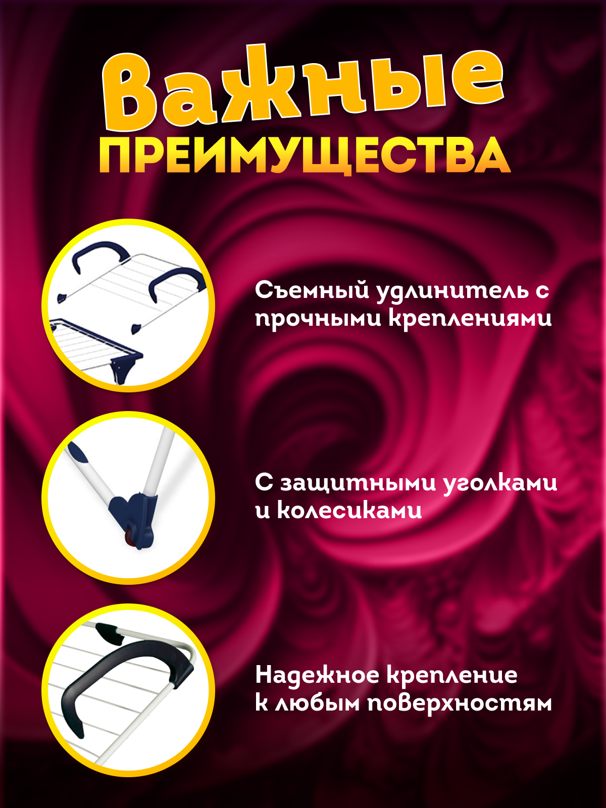2) Лакокрасочное покрытие устойчивое, ржавчины нет 3) Надежная - прутики не провисают, не ржавеют 4) При раскладывании, ножки защелкиваются в пластиковые крепления. За 6 лет крепеления такие же надежные, как новые. 5) Легко перекатить даже с бельем, т.к. на одной из опор есть колеса |