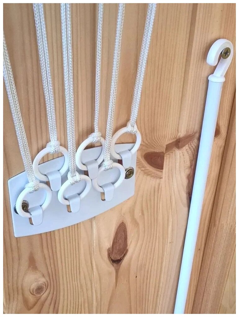 | Минусы: | Что бы поднять штангу сушки в верх нужно тянуться в верх палкой с крюком и ловить колечко... квест какой то для детей. |