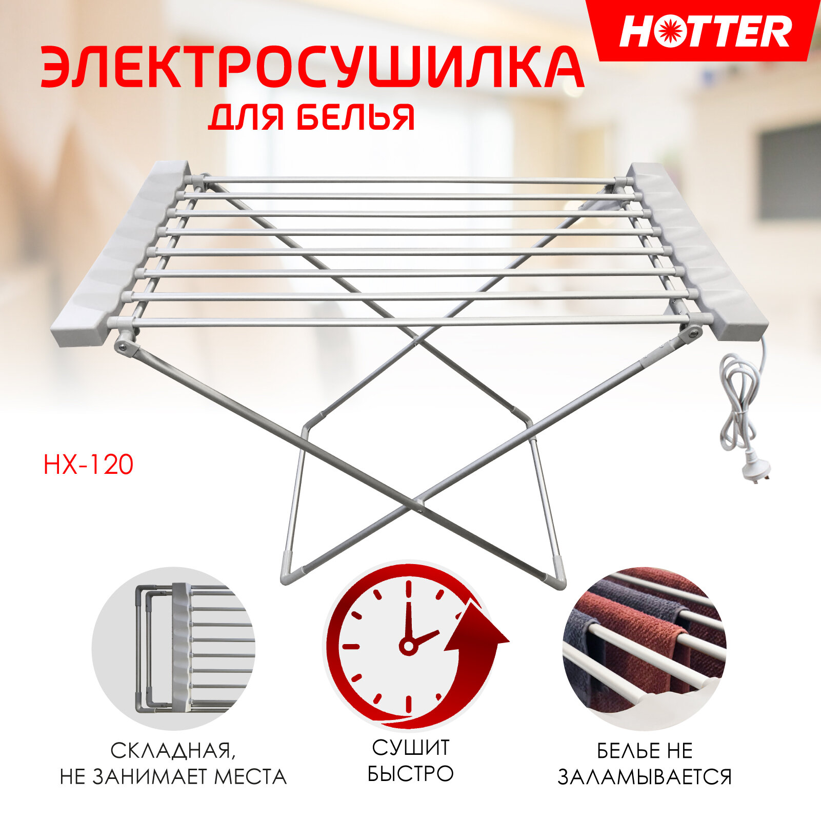 Сушилка для белья электрическая Hotter HX-120 напольная, складная, 8 прутьев, 120 Вт интересное: