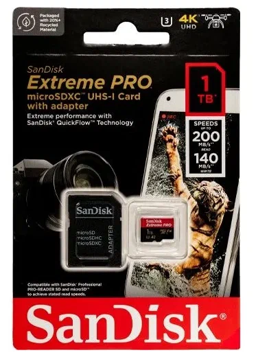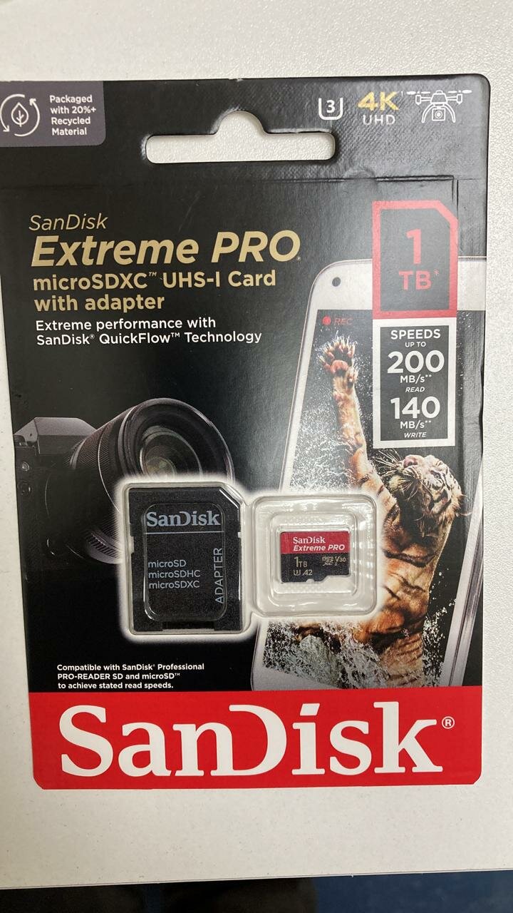 Ниже Вы можете прочитать отзывы на Карта памяти Sandisk microSDXC Extreme Pro A2 C10 V30 UHS-I U3 (200/140MB/s) 1TB + ADP, ознакомится с подробными характеристиками, посмотреть интересные обзоры и фотографии на Карта памяти Sandisk microSDXC Extreme Pro A2 C10 V30 UHS-I U3 (200/140MB/s) 1TB + ADP.