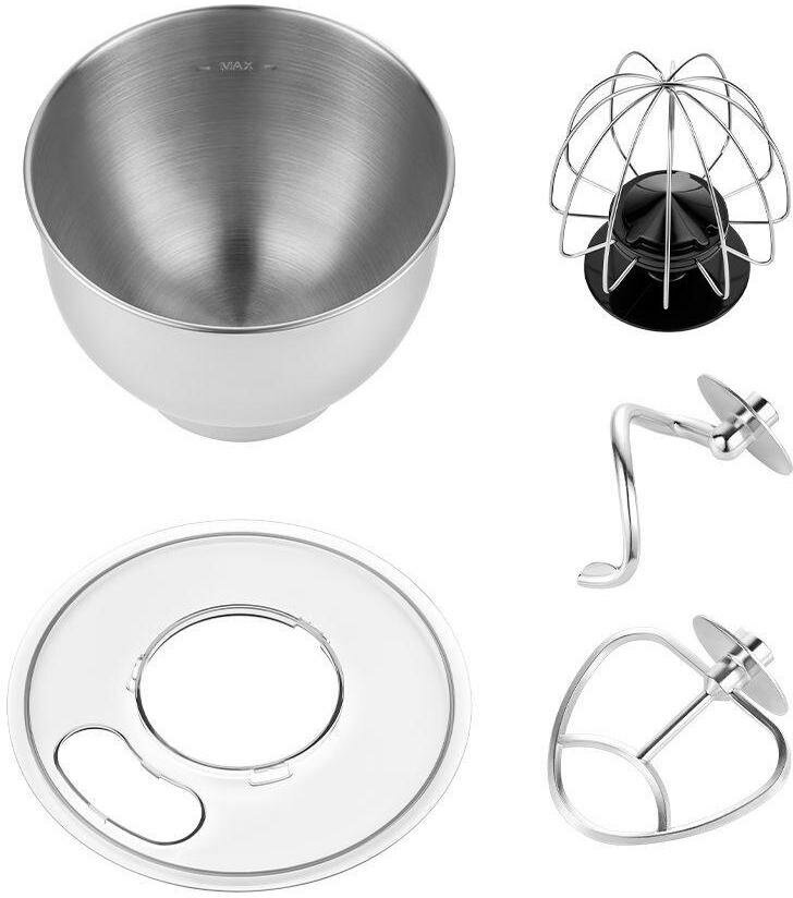 | Плюсы: | Наличие нескольких насадок для замешивания разного теста, вместительная чаша, крышка от брызг. |