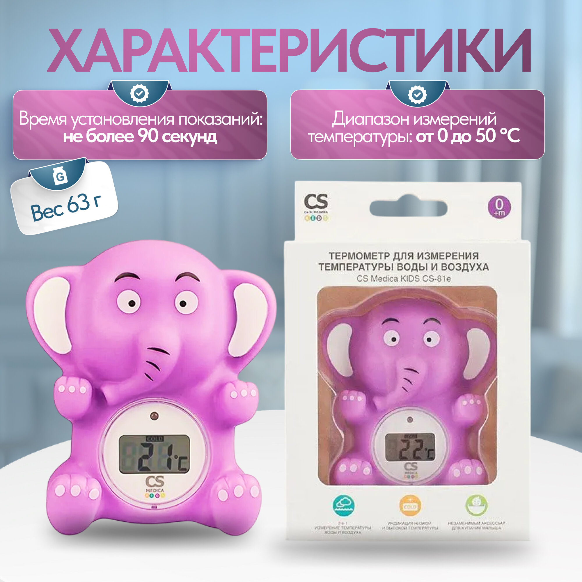 Безртутный термометр для измерения температуры воды и воздуха CS Medica KIDS CS-81e в форме игрушки "Слоник" фиолетовый