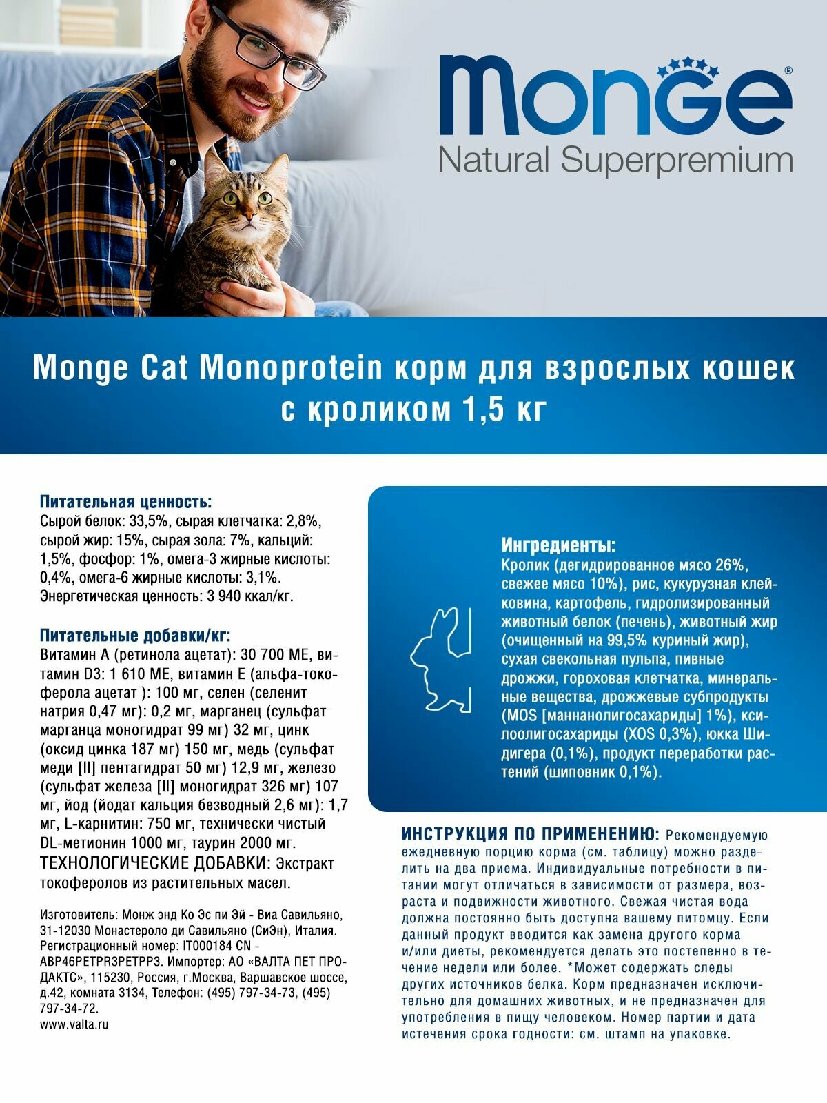 СохранитьСухой корм Monge Cat Adult Rabbit для взрослых кошек, Кролик 1,5 кг интересное: