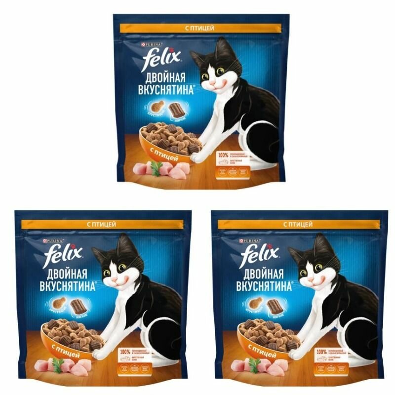 Сухой корм Felix Двойная Вкуснятина для взрослых кошек, с птицей, Пакет, 200г х 3 шт