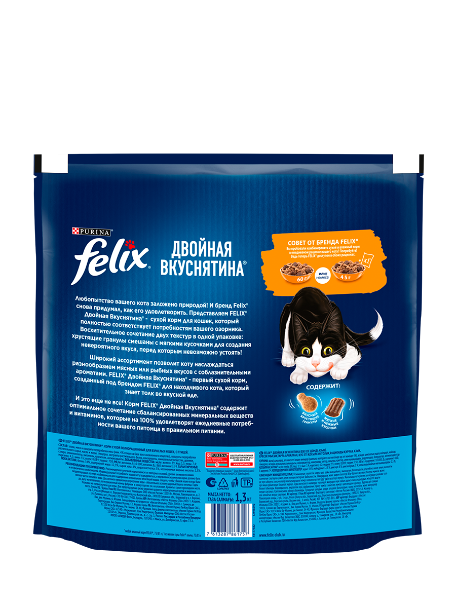 Сухой корм FELIX "Двойная вкуснятина" для кошек, птица, 600 г 9542076