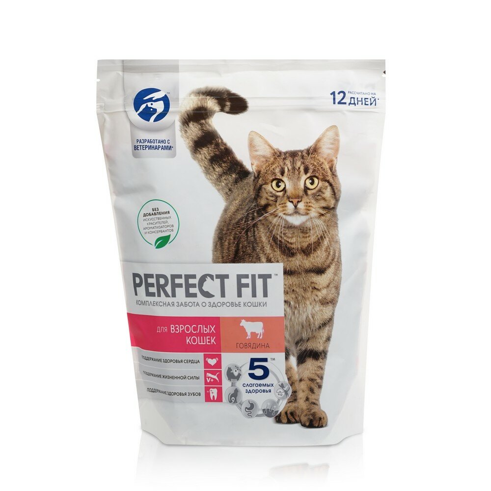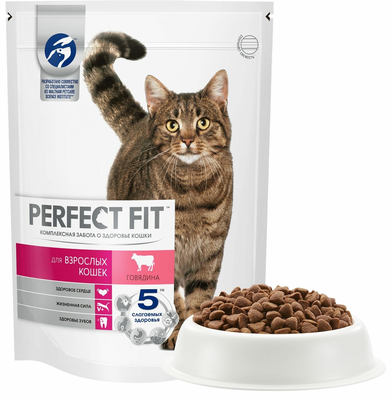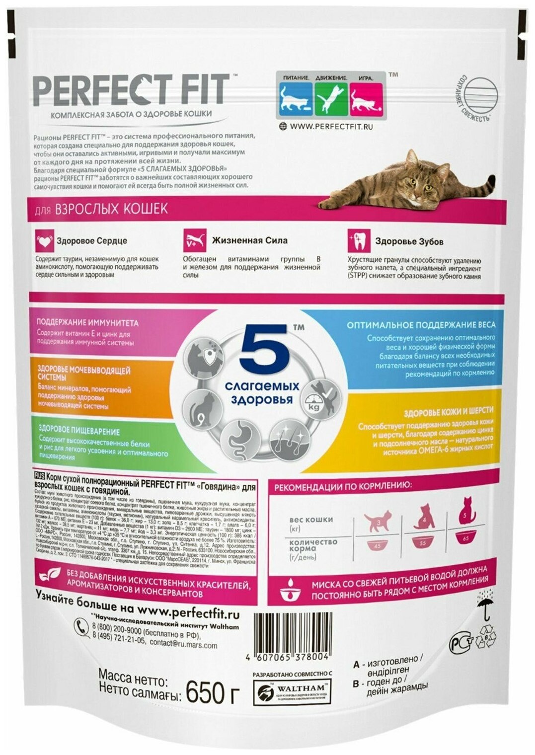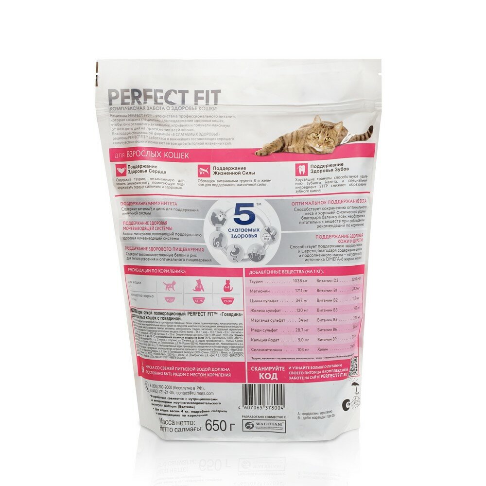 Полнорационный сухой корм Perfect Fit для взрослых кошек, с говядиной, 650г