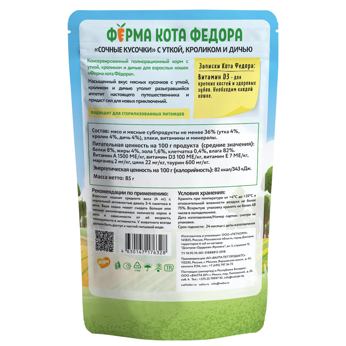 Купить Влажный корм для взрослых кошек Мнямс Ферма кота Федора 85г*24шт Мясные кусочки с уткой, кроликом, дичью