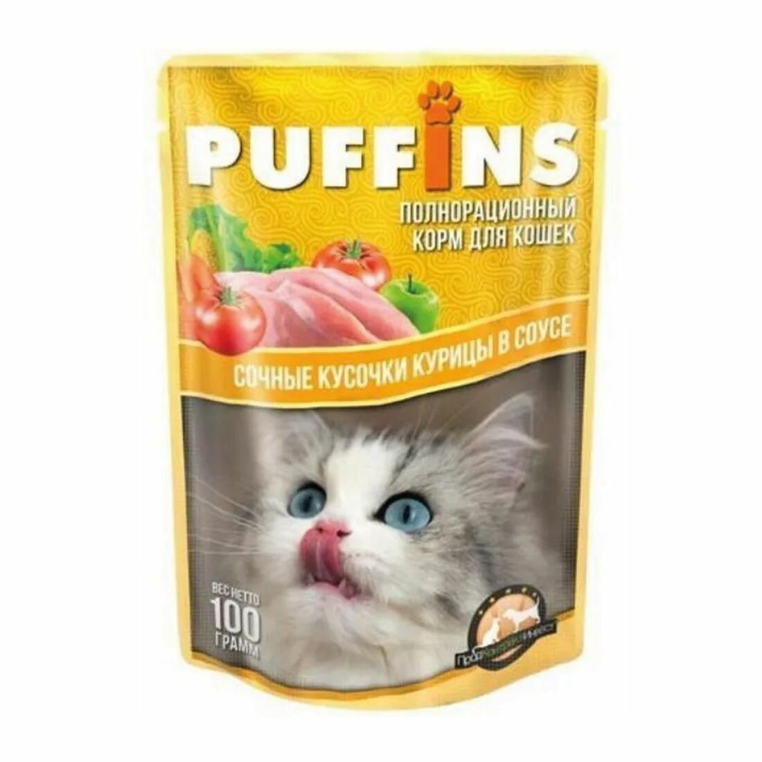 Влажный корм "Puffins" для кошек, сочные кусочки курицы в соусе, 100 г
