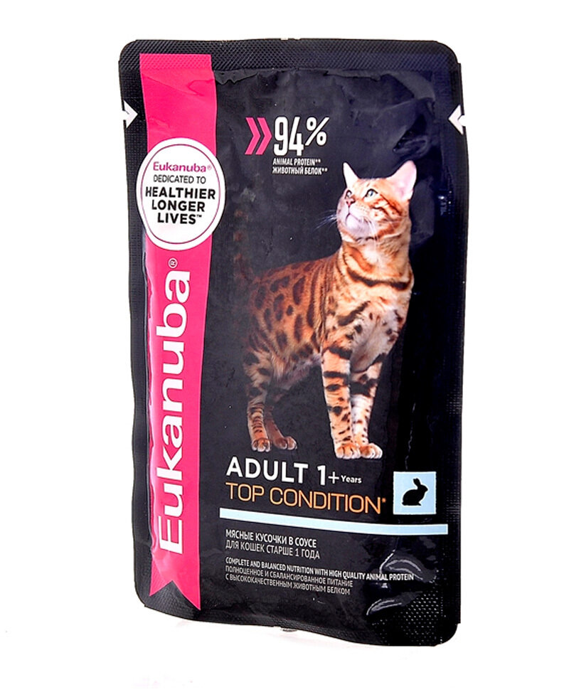 Влажный корм для кошек Eukanuba Top Condition Adult 1+ years, для здоровья кожи и блеска шерсти, с кроликом, 85 г (кусочки в соусе)