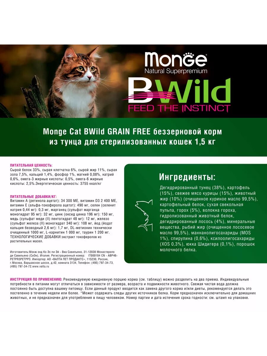 Ниже Вы можете прочитать отзывы на Беззерновой сухой корм для стерилизованных кошек Monge, Тунец 1,5 кг, ознакомится с подробными характеристиками, посмотреть интересные обзоры и фотографии на Беззерновой сухой корм для стерилизованных кошек Monge, Тунец 1,5 кг.