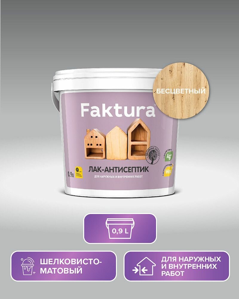 Лак-антисептик Faktura, шелковисто-матовый, полиакриловый, бесцветный, для внутренних и наружных работ, 0.9 л