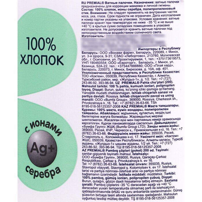 Ватные палочки PREMIAL, гигиенические, 200 штук, пакет.