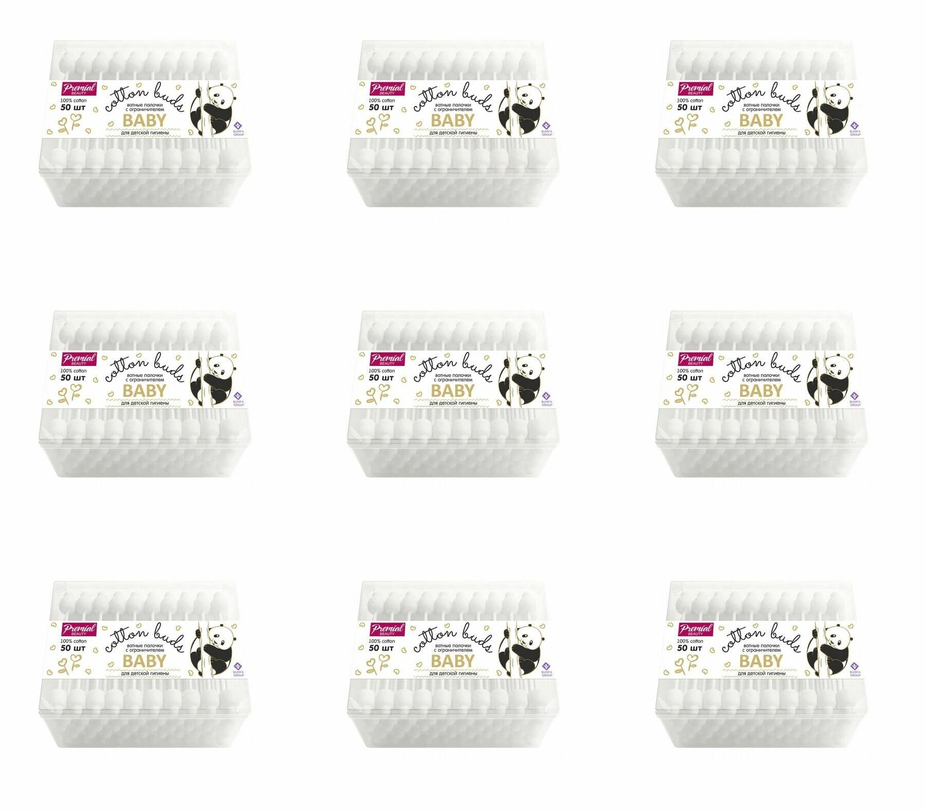Ватные палочки для детской гигиены PREMIAL с ограничителем, 100% хлопок, 50 шт