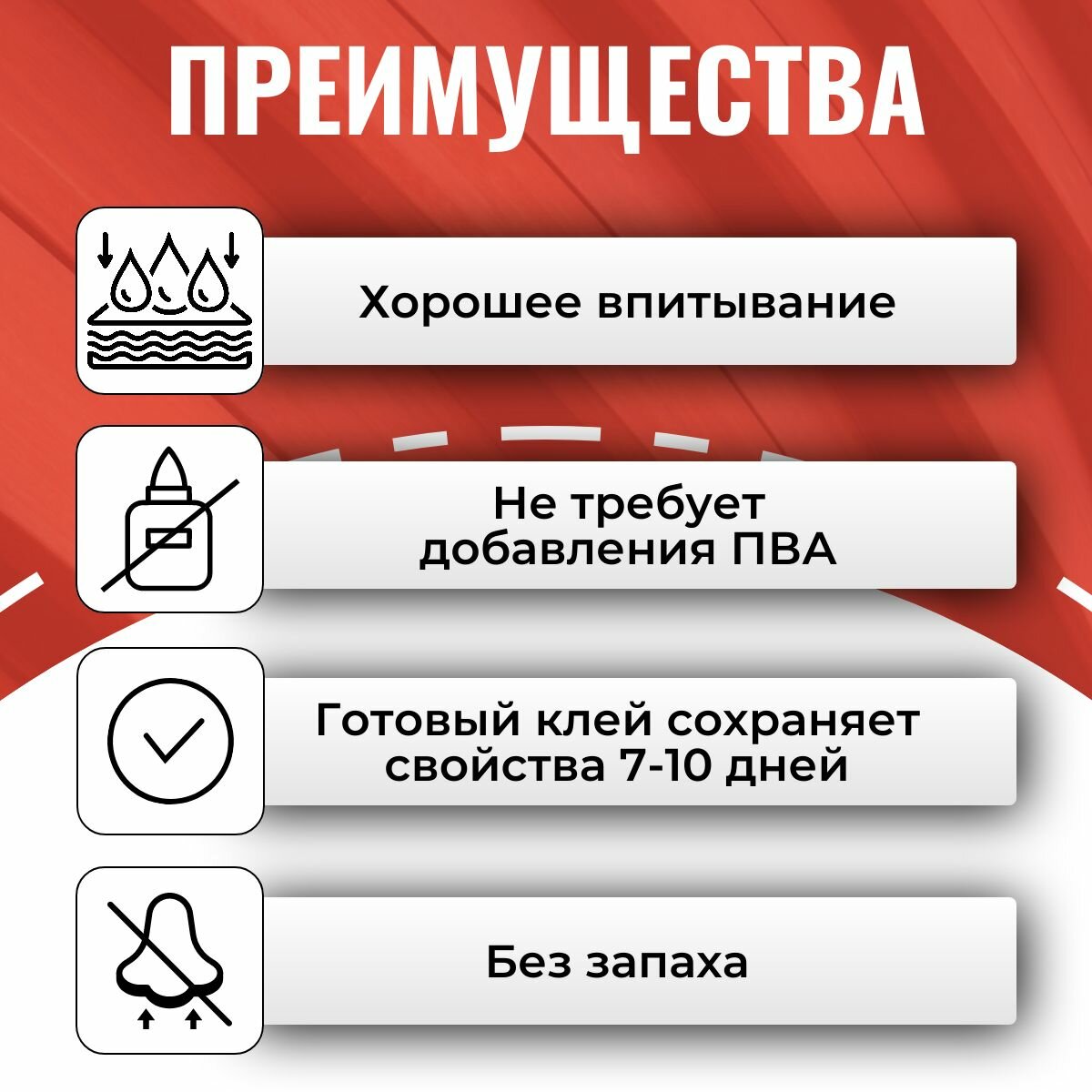 | Плюсы: | клей после разбавления водой прозрачный - не желтеет.Экономичный. |