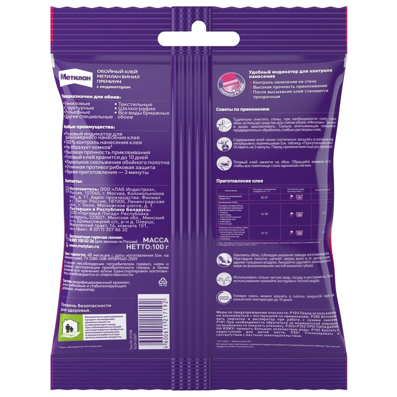 Метилан Винил Премиум с индикатором клей обойный (100г) / METYLAN Винил Премиум с индикатором клей для виниловых обоев (0,1кг)