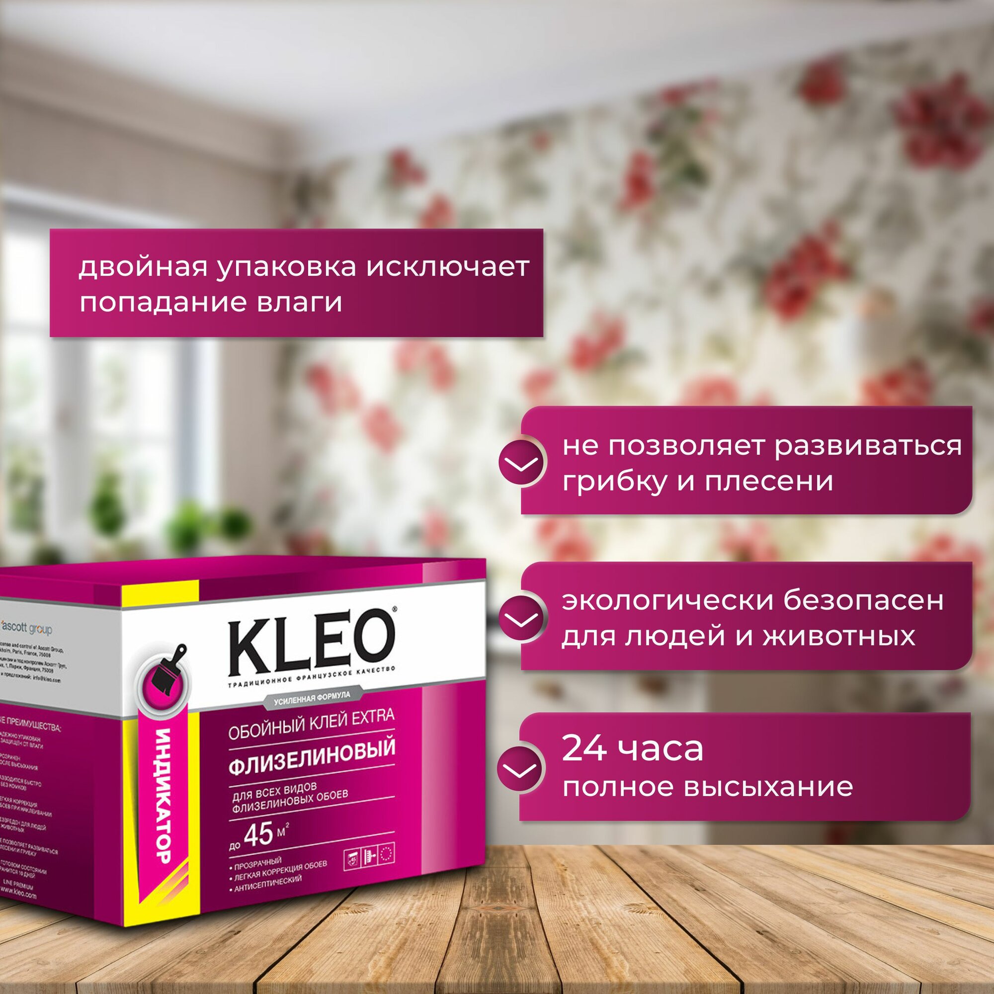 Клей для обоев KLEO EXTRA INDICATOR 45 усиленная формула с индикатором,обойный клей для виниловых, флизелиновых, бумажных, для обоев на основе малярного флизелина, антигрибковая и антисептическая формула Клео Экстра