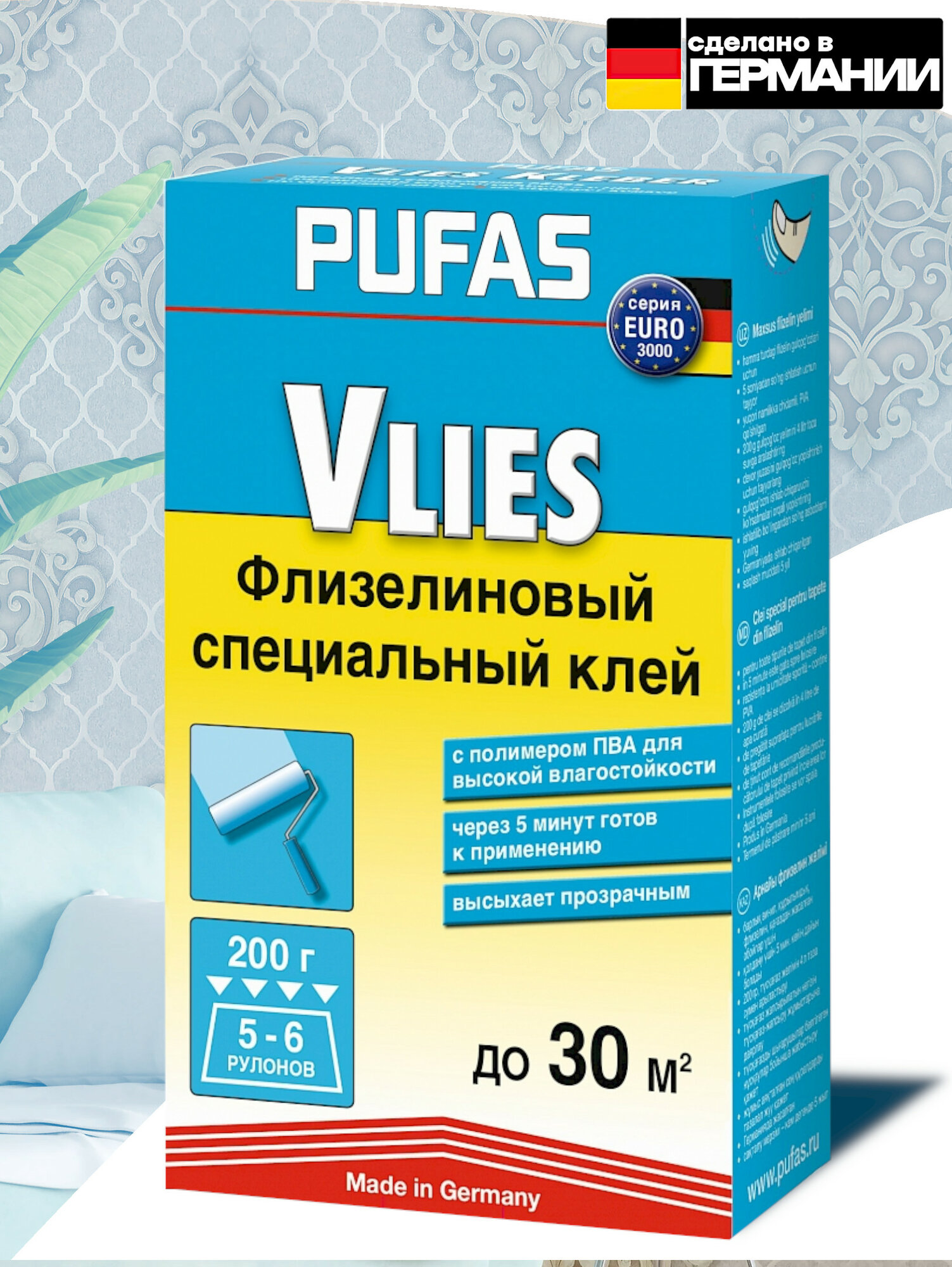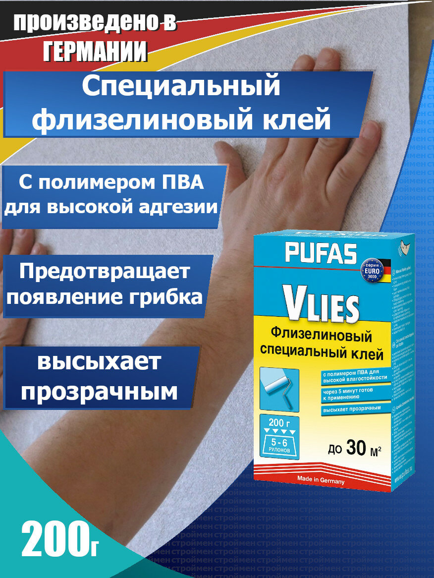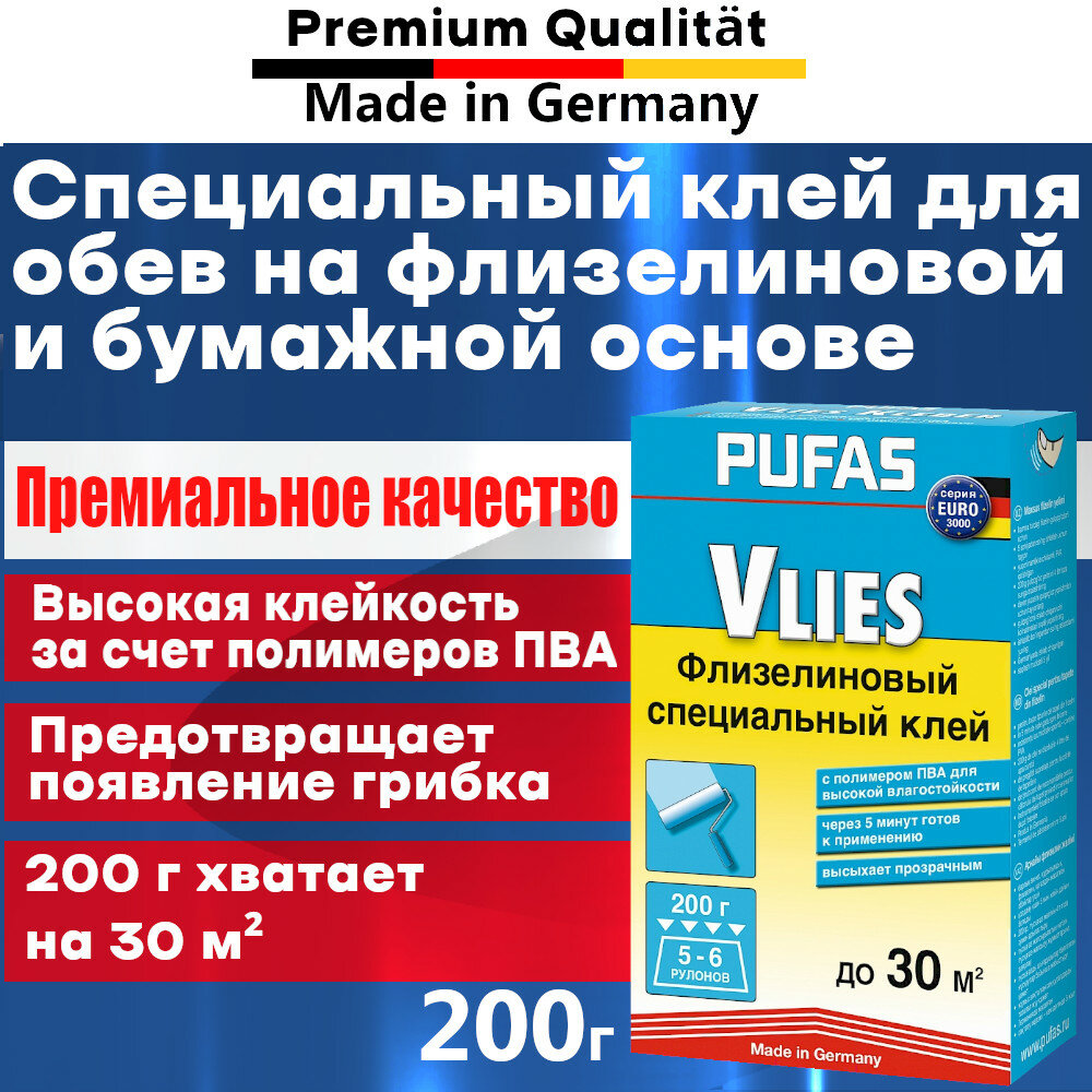 СохранитьКлей для обоев специальный флизелиновый, Pufas Euro 3000 Vlies Kleber,200 г., для обоев на флизелиновой и бумажной основе. Производство Германия Пуфас интересное: