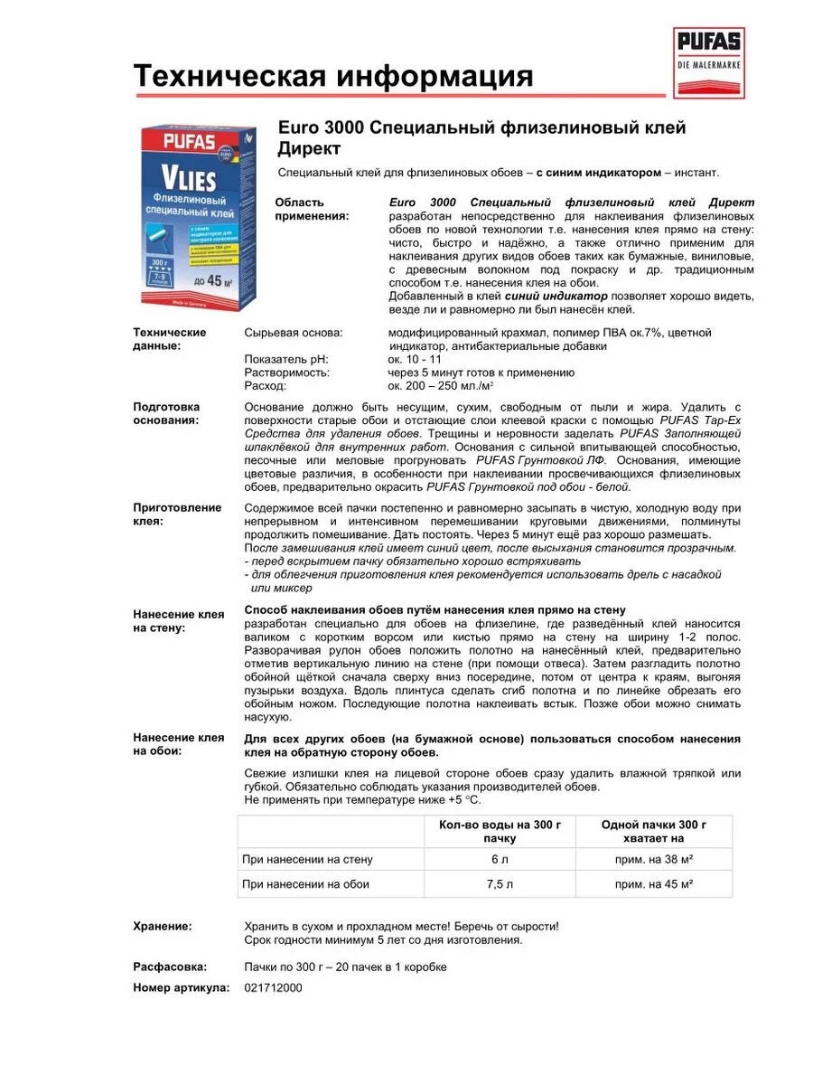 Клей для обоев специальный флизелиновый, Pufas Euro 3000 Vlies Kleber, 500 г., для обоев на флизелиновой и бумажной основе.