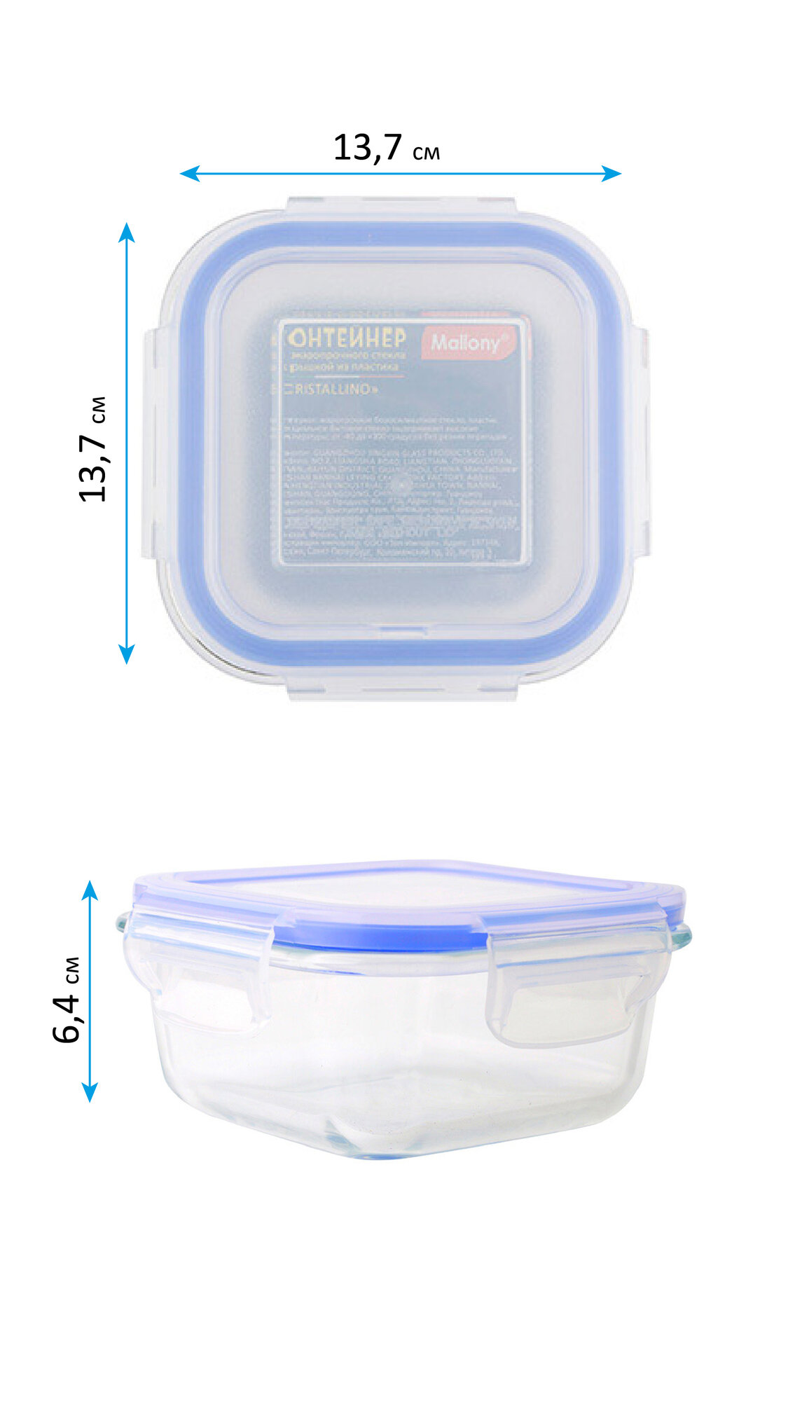 Контейнер для продуктов MALLONY Cristallino, 0,53 л, 14,2х14х6,7 см, квадратный, жаропрочное стекло, пластик