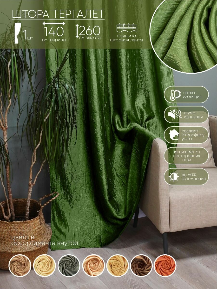 Штора портьерная Тергалет 140х260 см, зелёный, 100% п/э