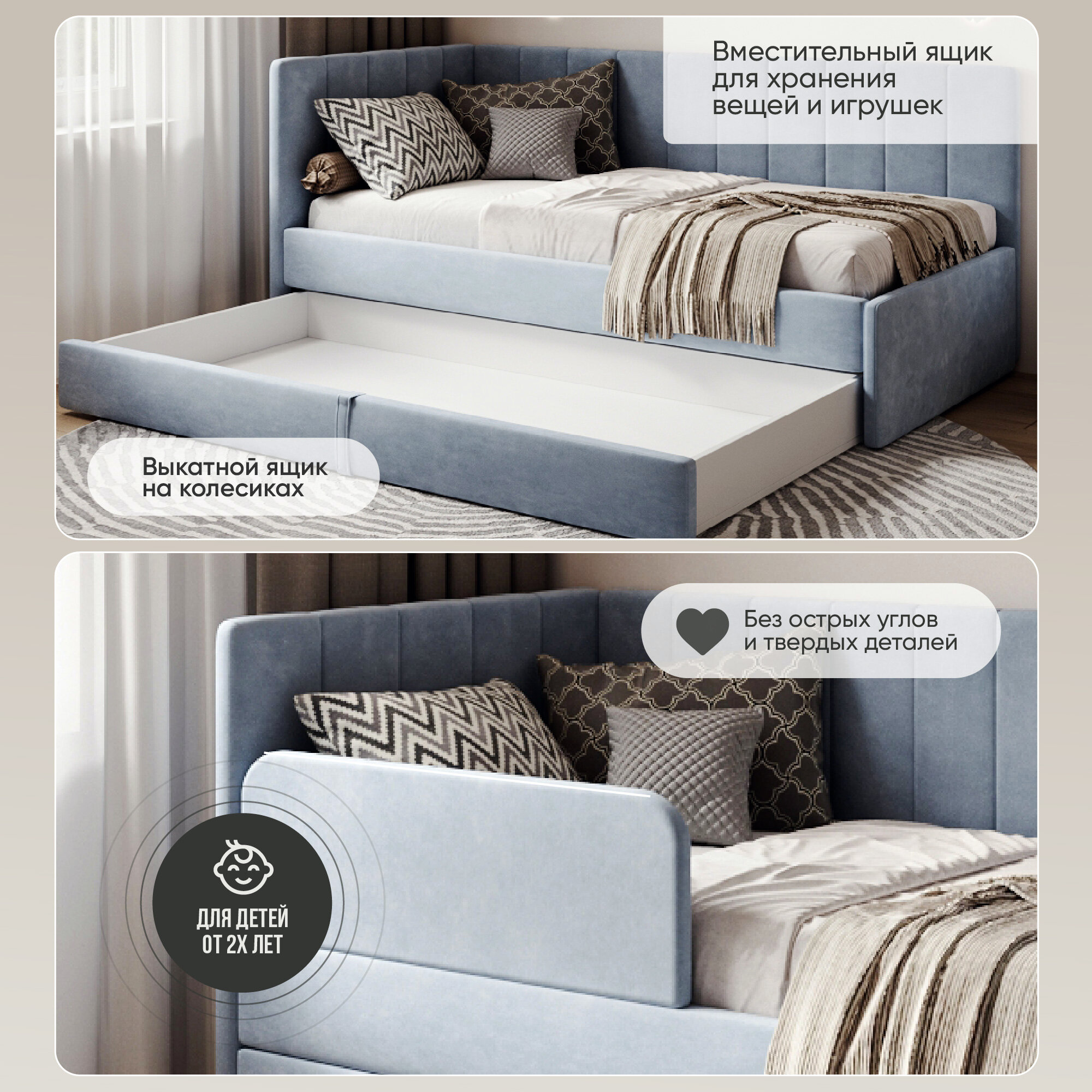 Кровать детская Huggy с защитным бортиком и выкатным ящиком 200х90 см, цвет Голубой, диван кровать с мягким изголовьем