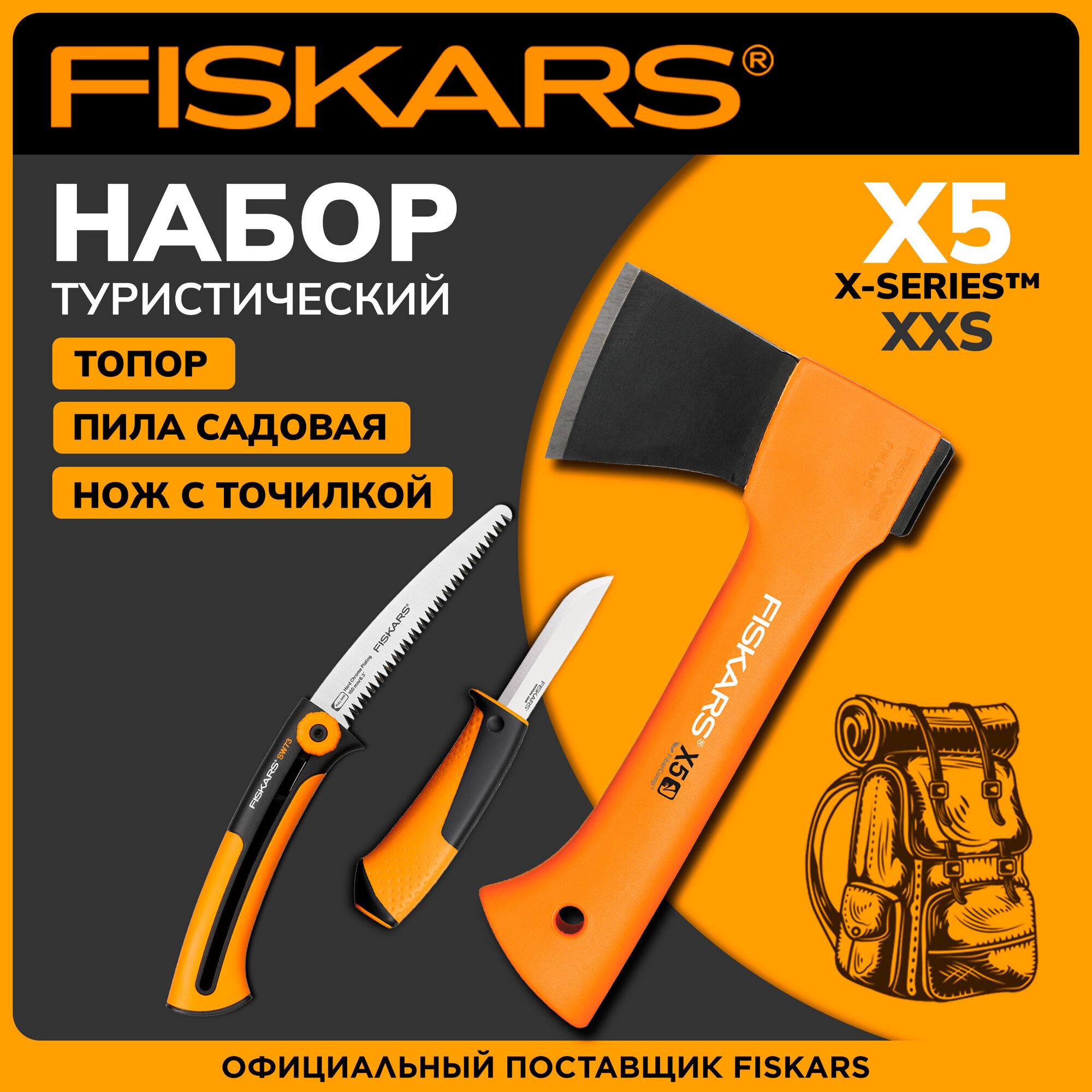 Купить Набор инструмента топор туристический X5 + нож + пила садовая SW73 FISKARS (1057912)
