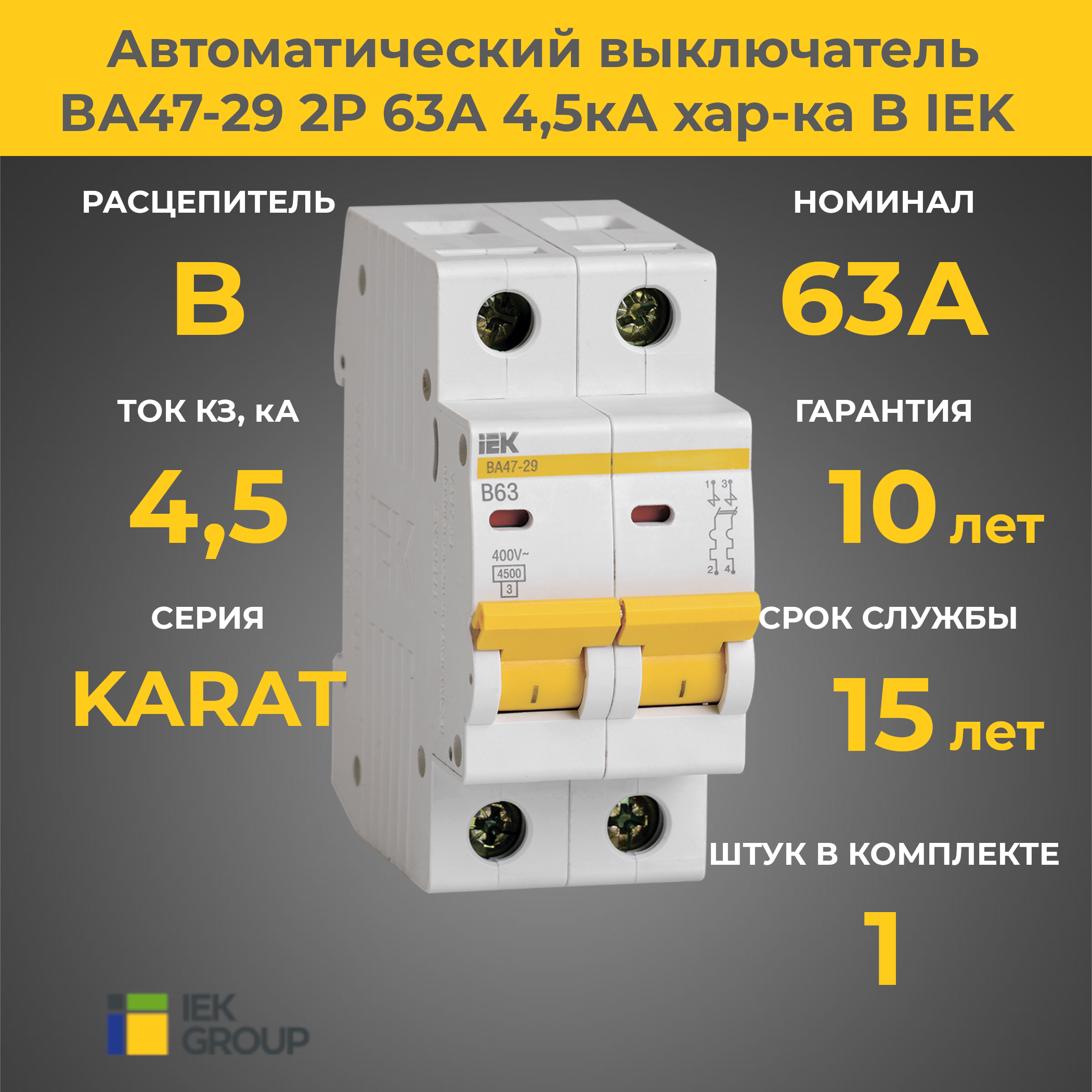 Автоматический выключатель IEK ВА47-29, 2Р, 63А, 4,5кА, х-ка В MVA20-2-063-B