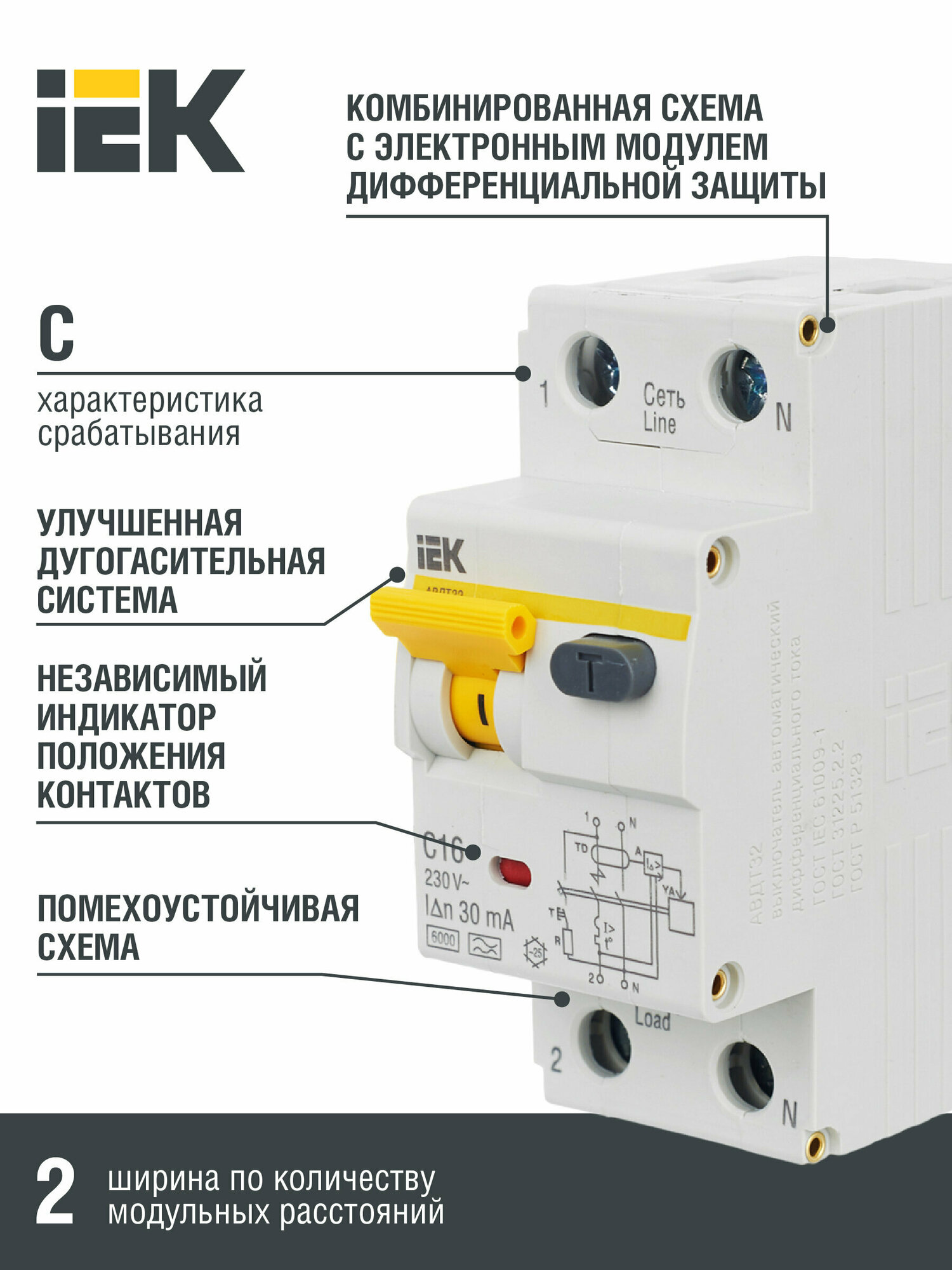 Дифф. автомат АВДТ32 2Р 16А 30мА 6кА С IEK