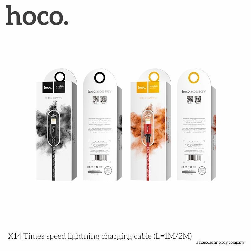 Кабель для быстрой зарядки HOCO X14 Times speed, USB to Lightning, 2А, 1 метр, Красный+Черный