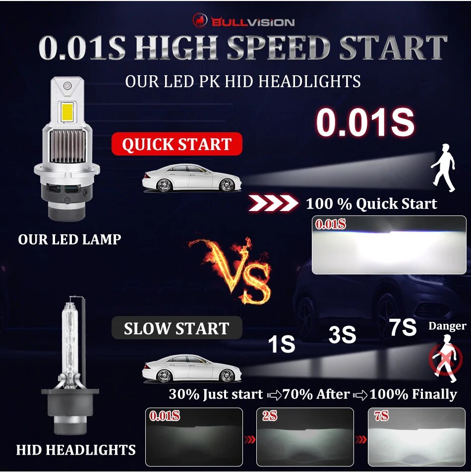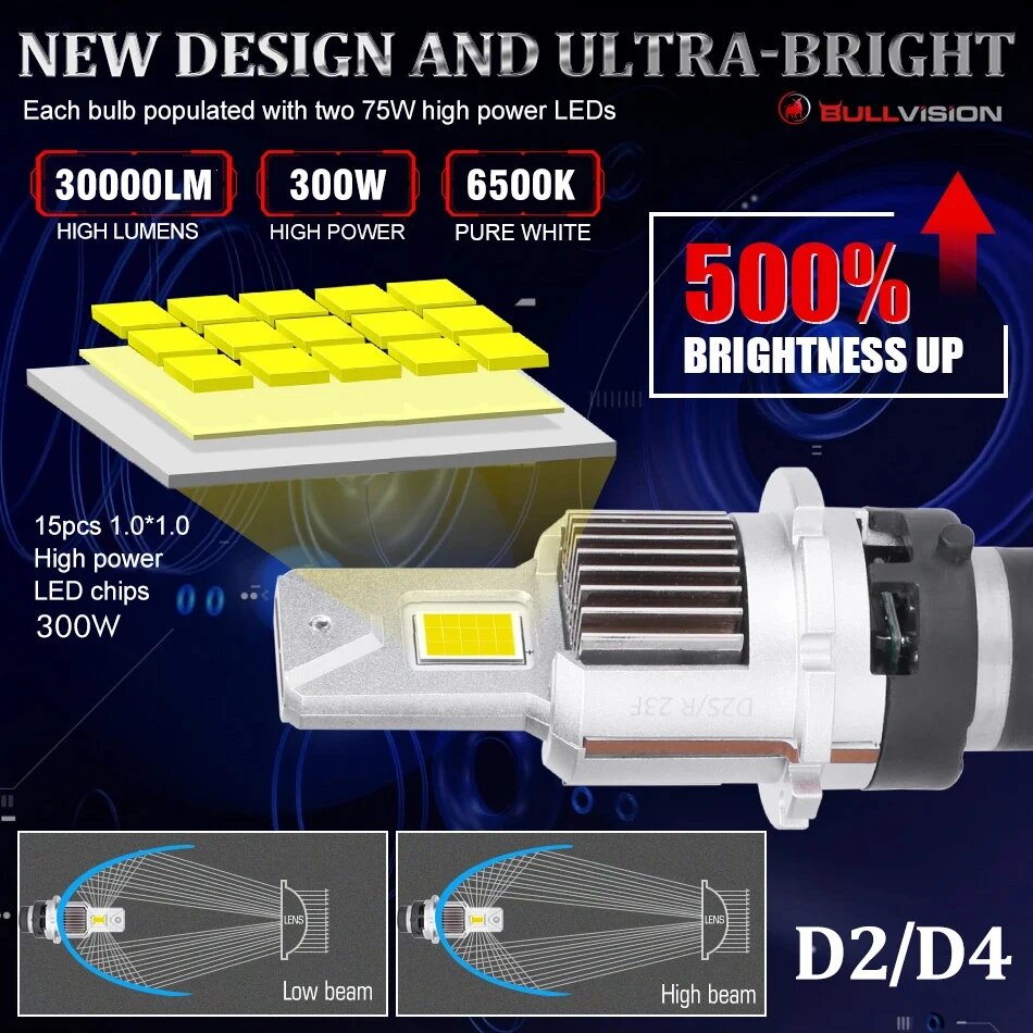 Bullvision D2S D4S 1:1 светодиодный фары HID D1S D3S D5S D8S D1R D3R Kit Xeon светодиодный 300 лм 6500 Вт двухсторонний очень большой CSP чип K, Powerful finned Fan, 30Pcs CSP LED, D4S интересное: