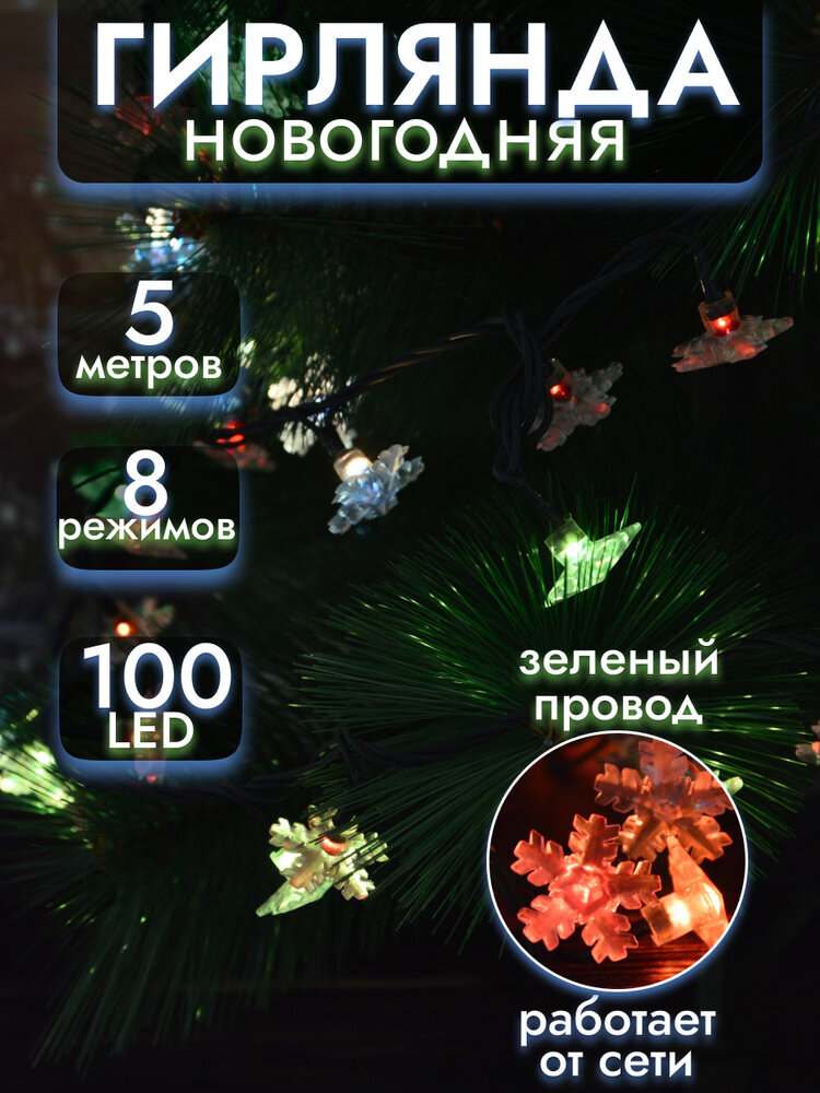 Электрогирлянда "Снежинки" Sf-100-5-mc 101576 (24/1) 100 рисовых ламп многоцветная длина 5 метров 8 .