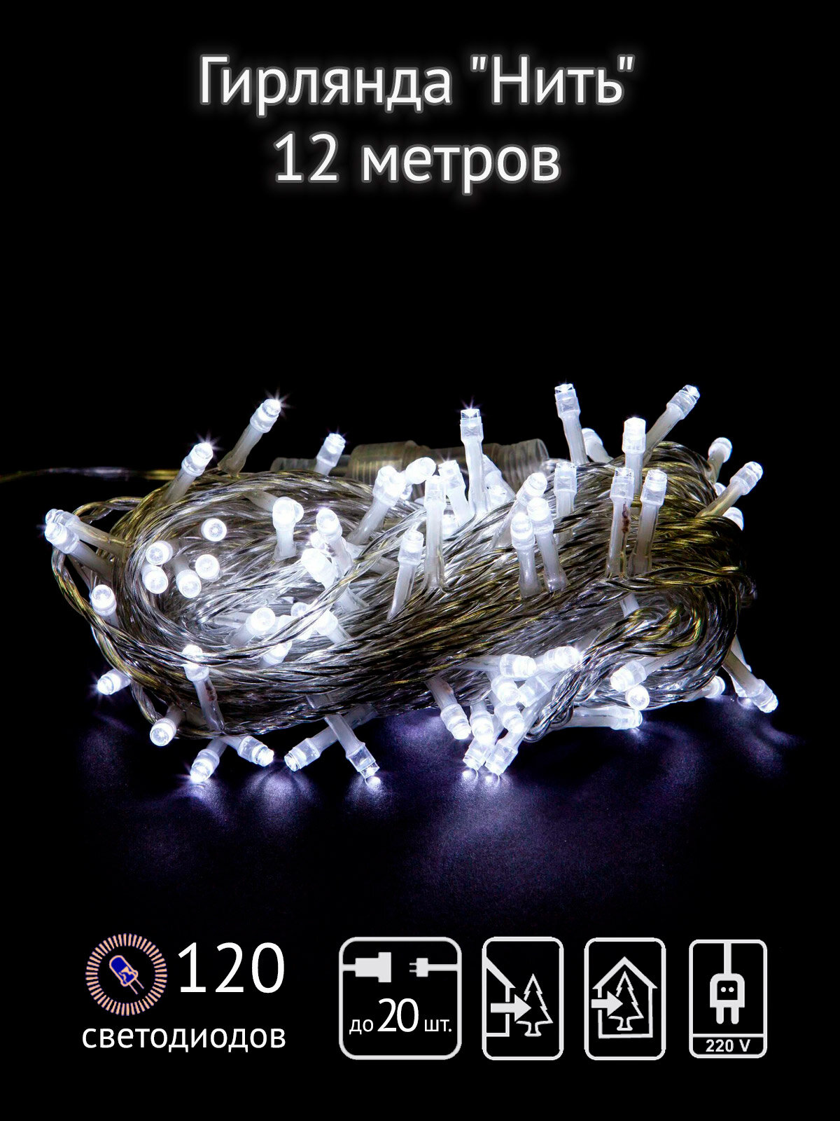 Гирлянда Нить 12м LD120-WW-E 120 тепл. бел. светодиодов соединяемая до 20шт уличная 469060, SHLIGHTS 4690601040503 (1 шт.)
