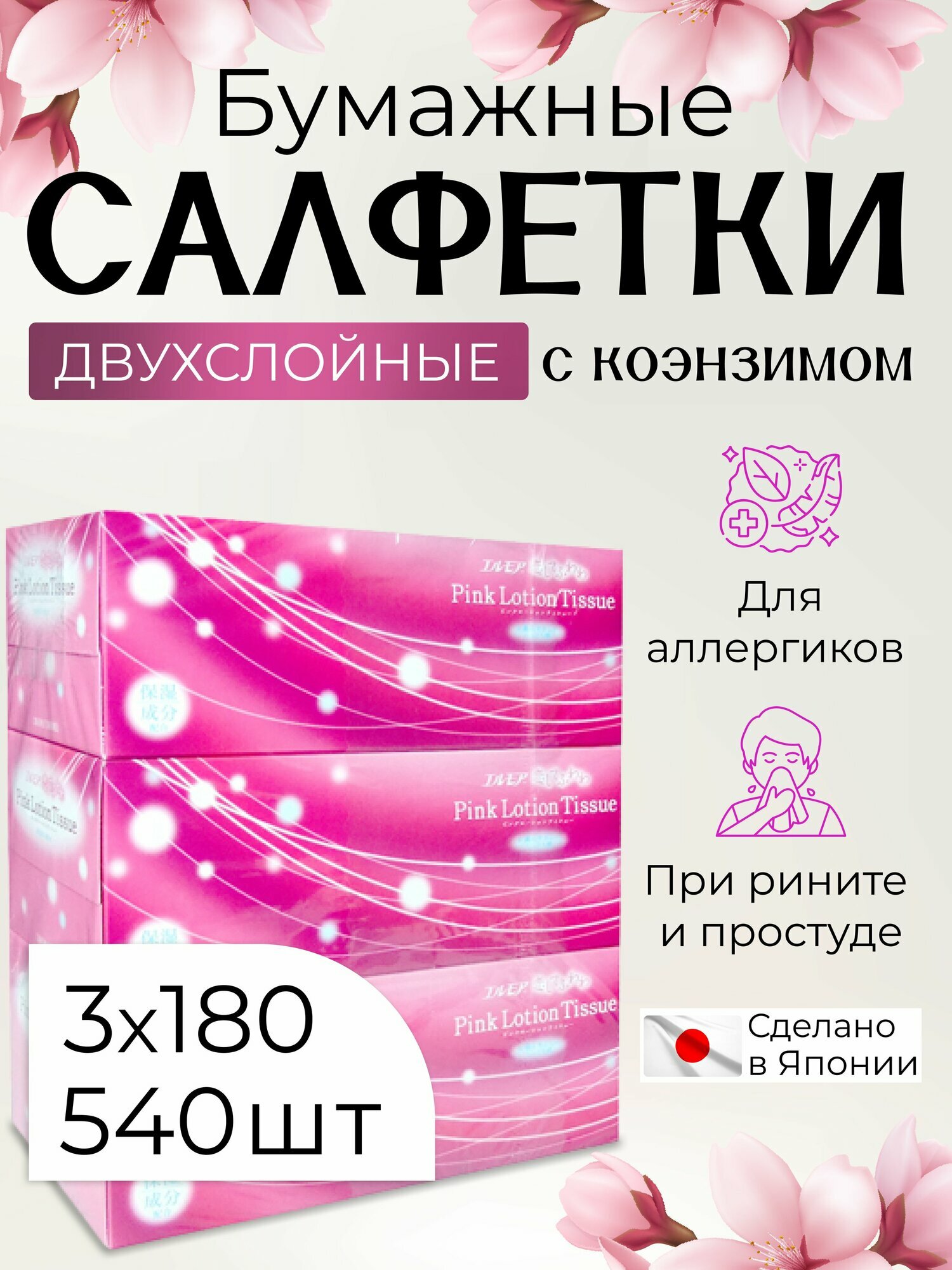 СохранитьCалфетки бумажные двухслойные 3 уп. по 180 шт. с коэнзимом Q10 розовые Kami Shodji Япония, Платочки косметические носовые гигиенические без ароматизаторов гипоаллергенные экологичные интересное: