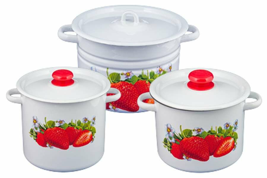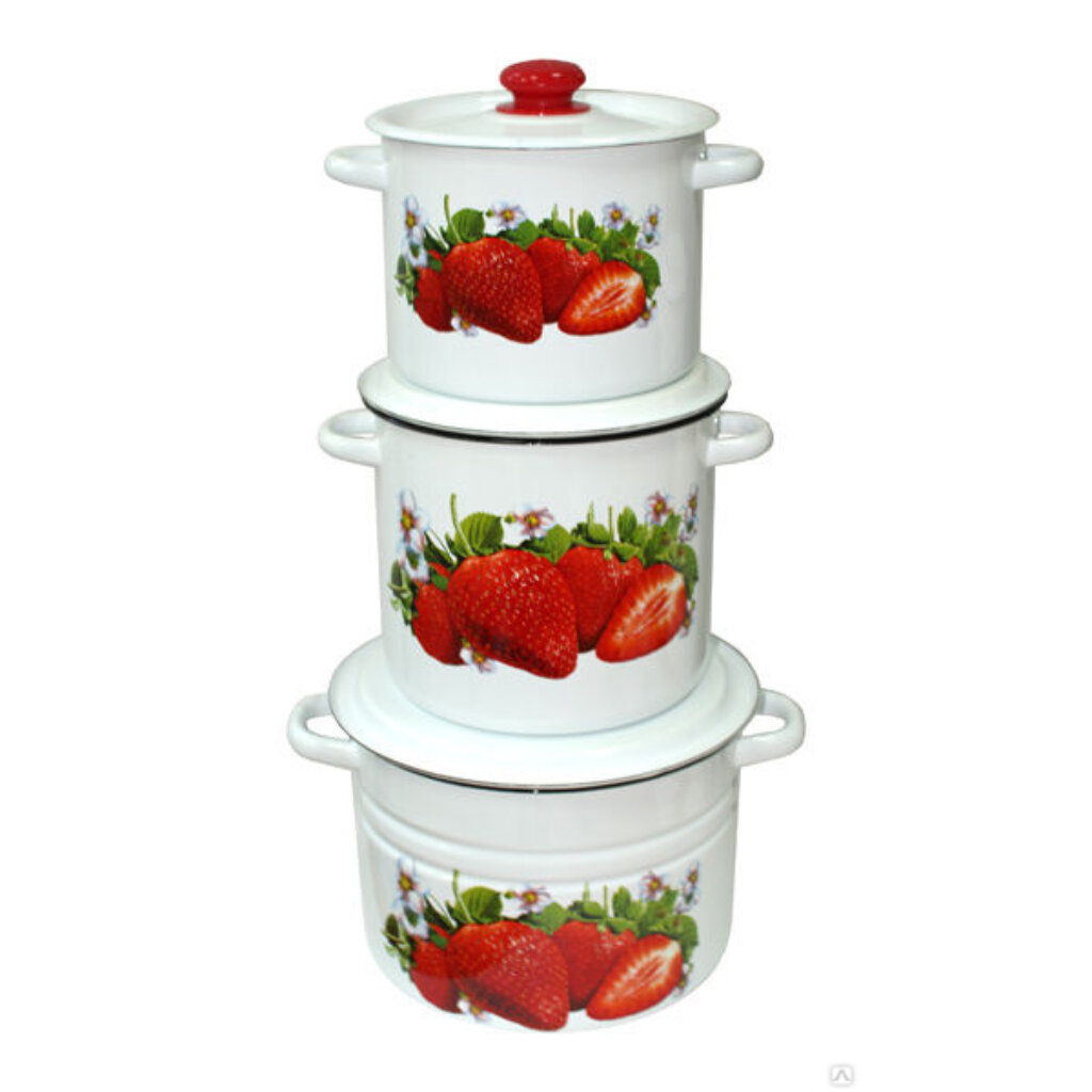 Сибирские товары Набор кастрюль «Клубника садовая», 3 предмета: 3,5 л, 5,5 л, 8 л, эмалированные крышки, индукция