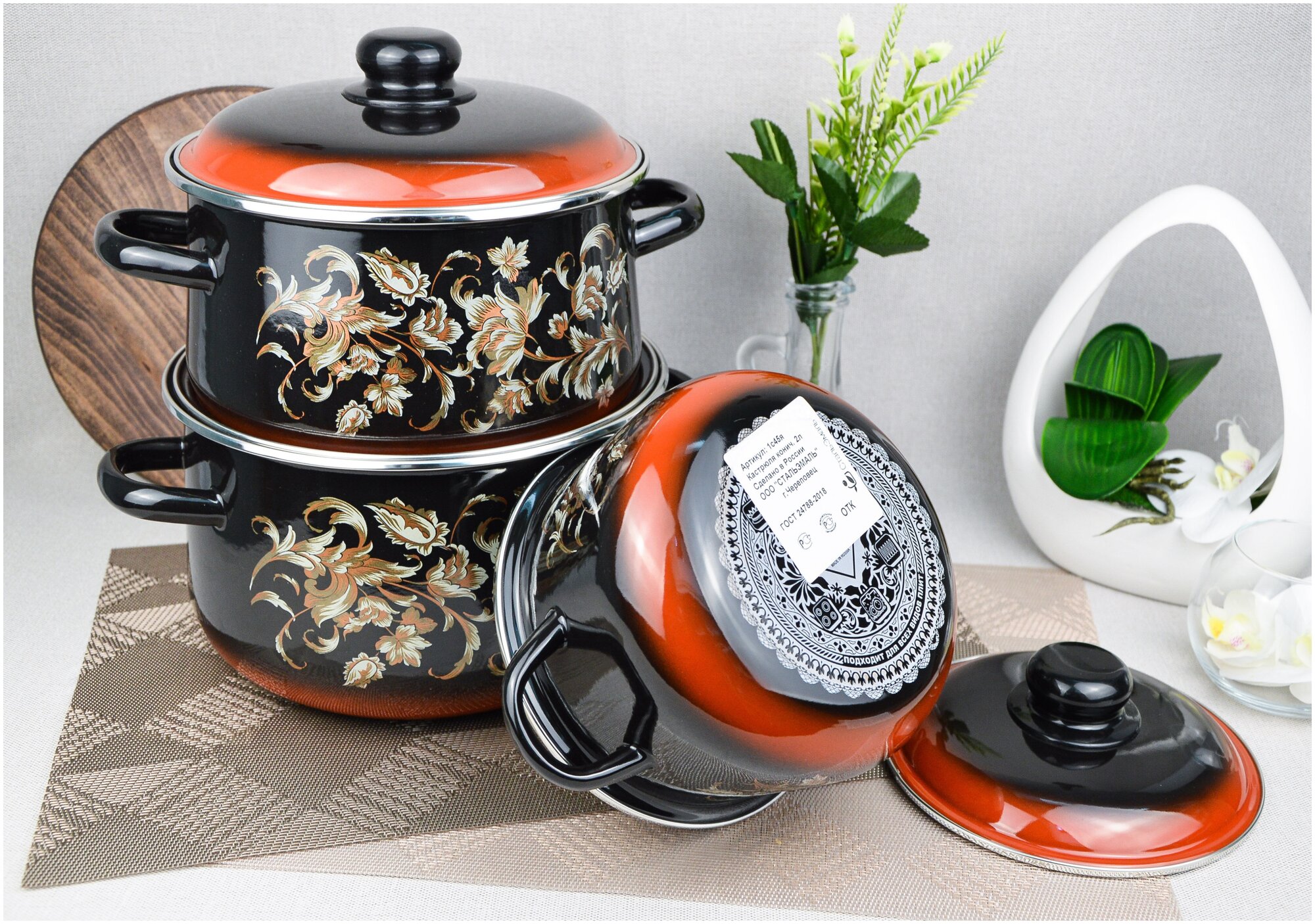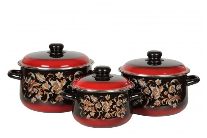 Набор посуды эмаль Стальэмаль "Жостово" 1С408, 3 предмета, 2л.; 4л.; 5,5л., крышка эмаль, ручки литые, с декором, черный