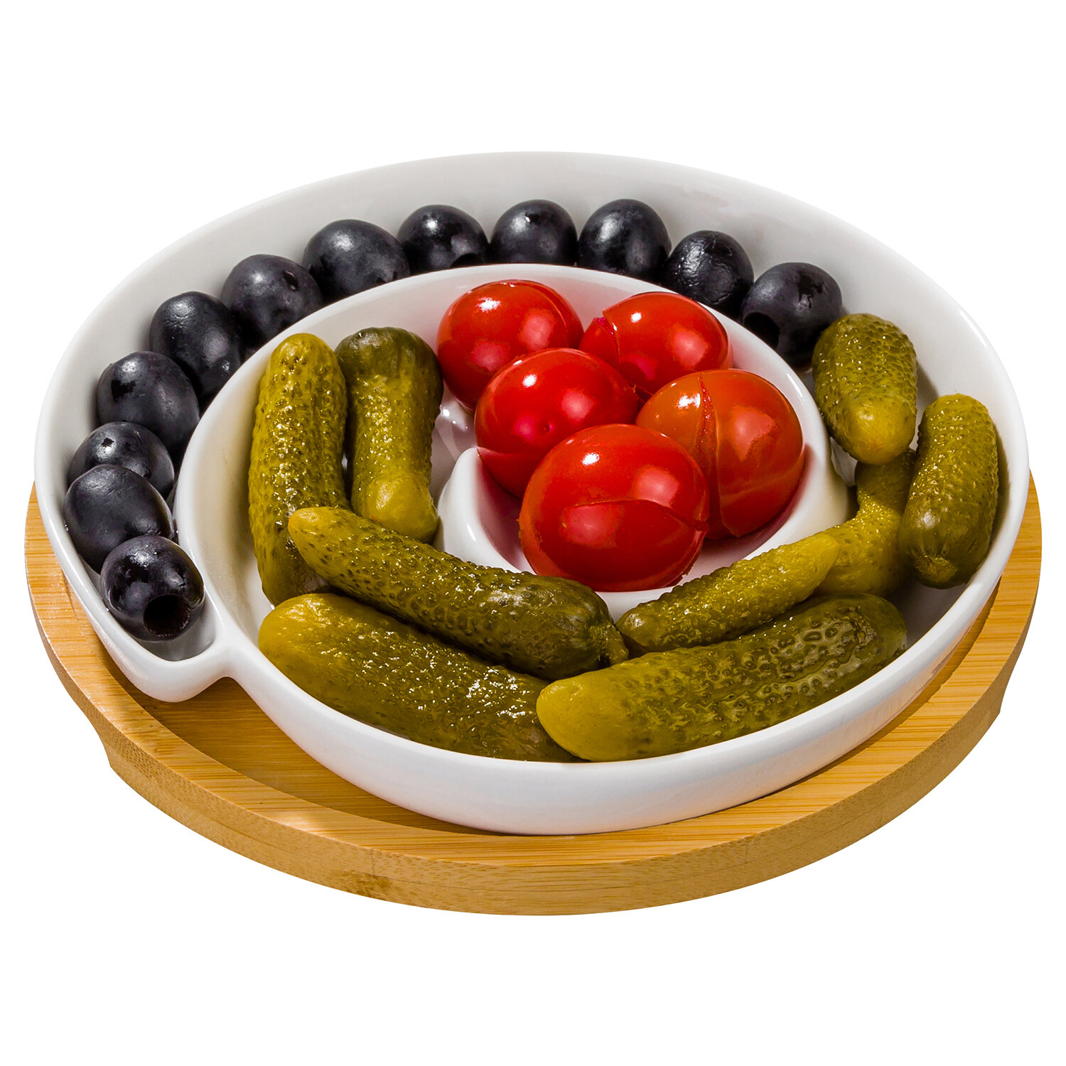 | Плюсы: | Очень интересная форма? На столе оригинально смотрится с оливками и маслинами, выложенными по кругу! |